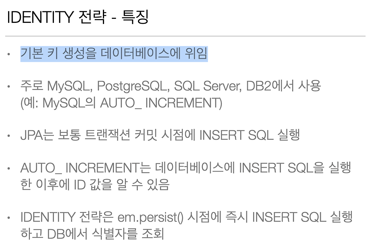 이 Identity 전략에서만 딱 예외적으로 db에 em.persist를 호출하자마자 데이터베이스에다가 Insert 쿼리를 날려버립니다.