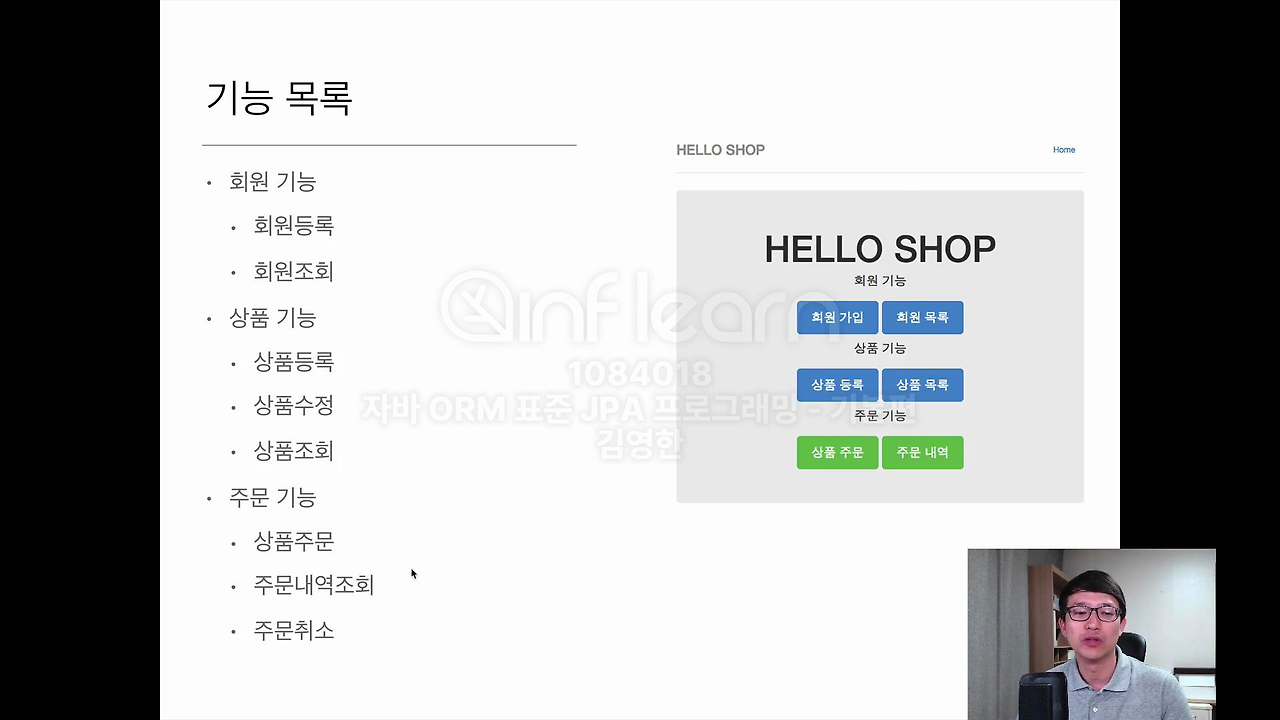 기능은 회원을 관례하고 상품을 등록하고 주문할 수 있고 이런 기능들이 있는 간단한 샘플입니다. 기본적인 굉장히 단순한 쇼핑몰 이라고 보시면 될 것 같구요.