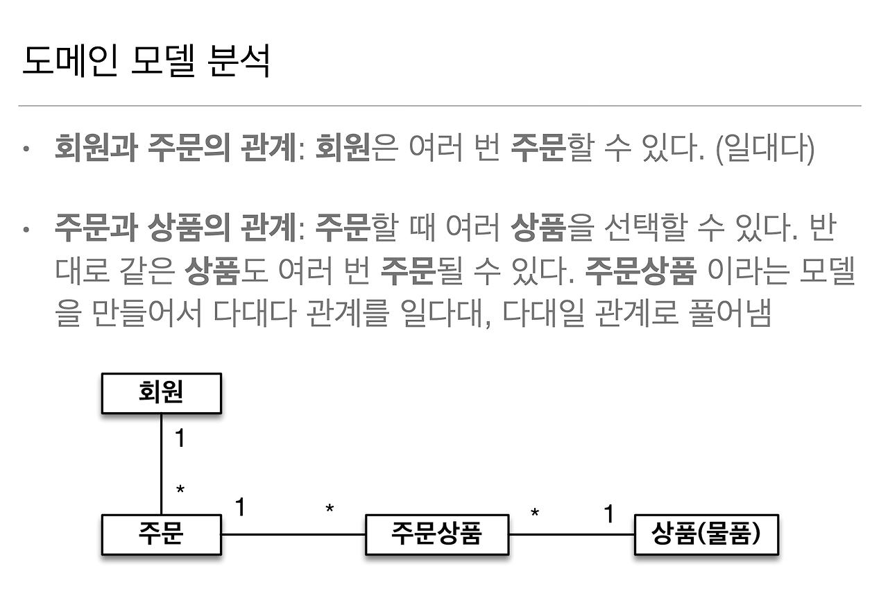 그래서 주문 상품이라는 모델을 만들어서, 다대다 관계를 일대다-다대일 관계로 풀어냅니다.