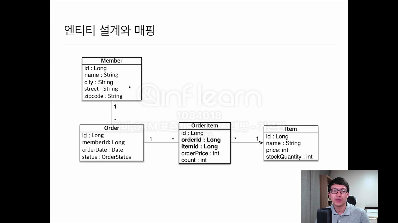 Order도 memberId, 그리고 Item도 id 쭉 있고, OrderItem을 보시면 어떤 id인지 id가 직접적으로 들어가 있습니다.