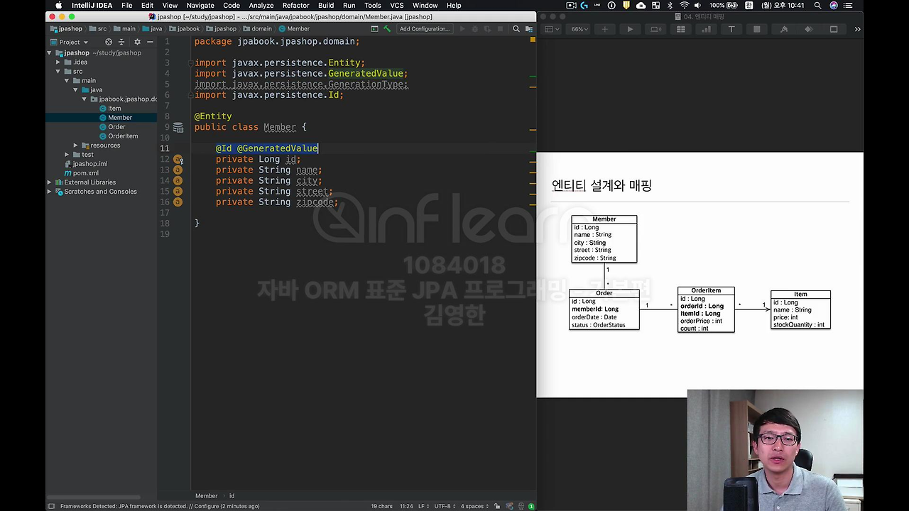 처음에는 보통 이렇게 나와요. 왜냐하면 아직 저희가 뭐 연관관계 맵핑을 안 배운 것도 있지만 보통 Order면 memberId가 들어가 있죠. 그냥 테이블이랑 똑같이 설계를 한 거 거든요. 이거에 대한 문제점이 뭔지 코드로 직접 해보면서 한번 설명을 드리겠습니다.