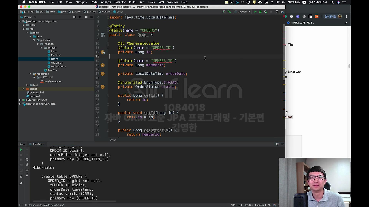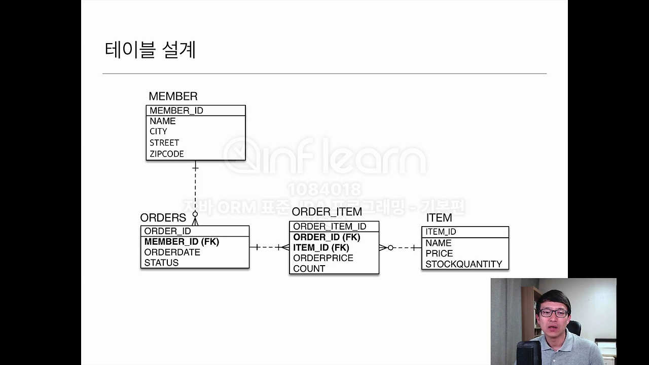 지금 Order 같은 경우에는 이전에 테이블을 보면 이 테이블명이 ORDERS라고 되어있죠. 왜 그러냐면 이게 DB마다 좀 다른데 이제 OrderBy 라고 DB에는 Order가 예약어로 걸려 있어요. 그래서 Order를 테이블 명으로 그대로 썼을 때 되는 DB도 있는데 안되는 DB도 있거든요. 그래서 그냥 ORDERS로 많이 씁니다.