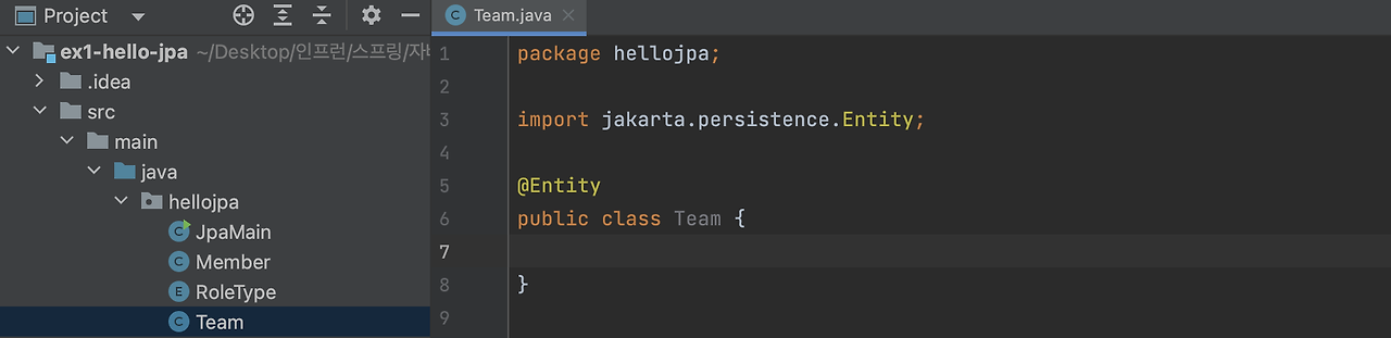 자 이렇게 하면 어떻게 되는지 코드를 작성해 보겠습니다. jpashop 말고 처음에 만들었던 프로젝트에다가 작성하겠습니다.