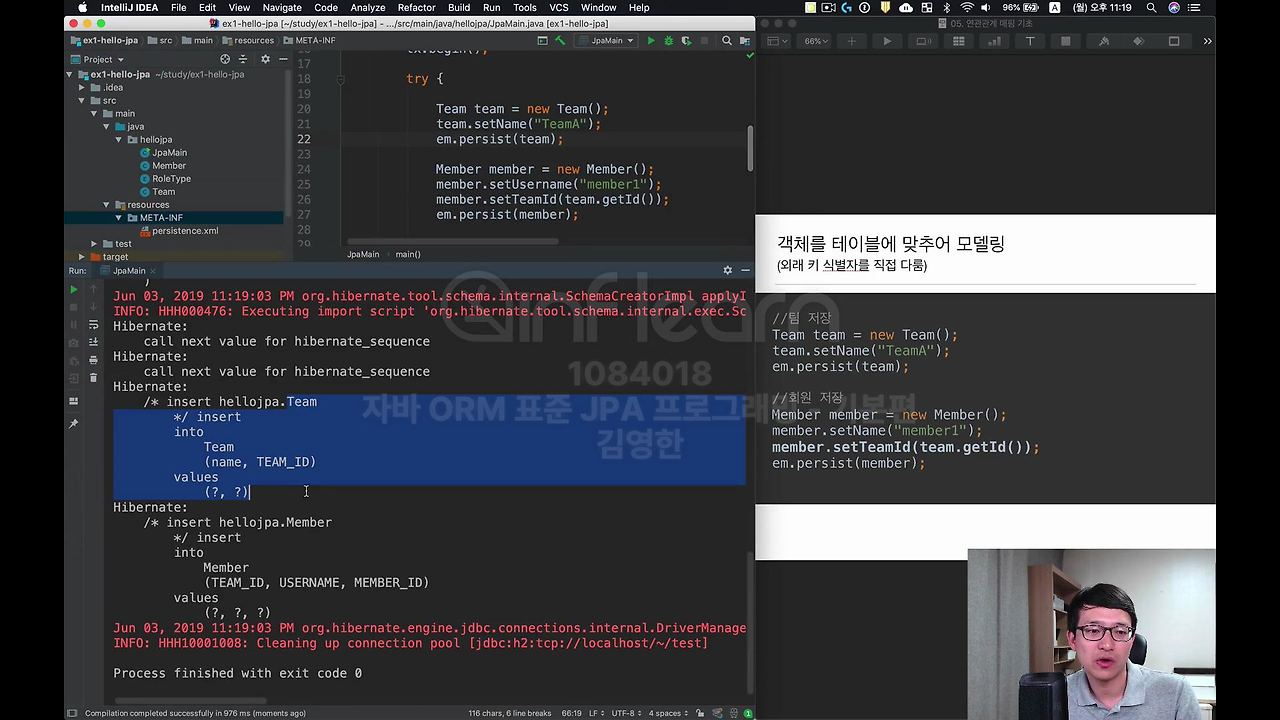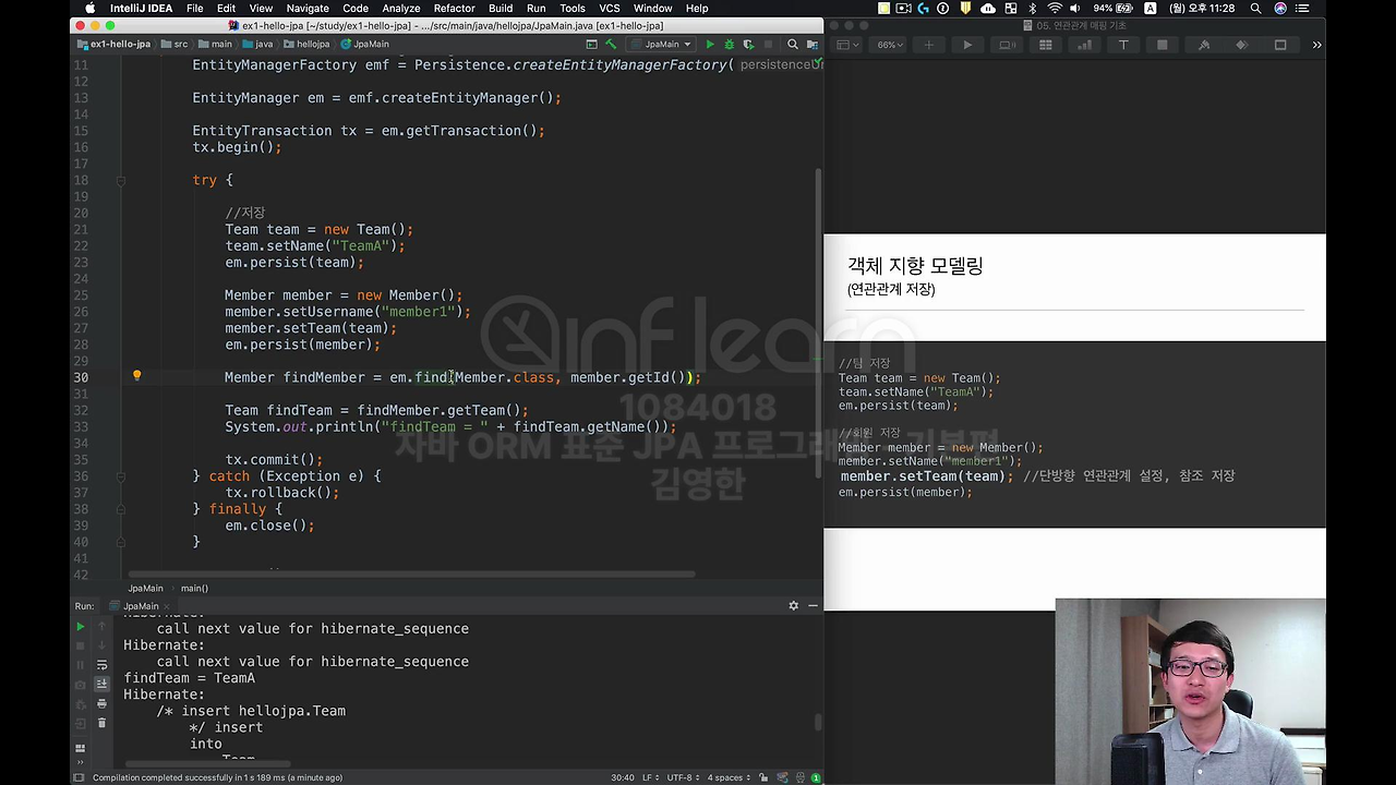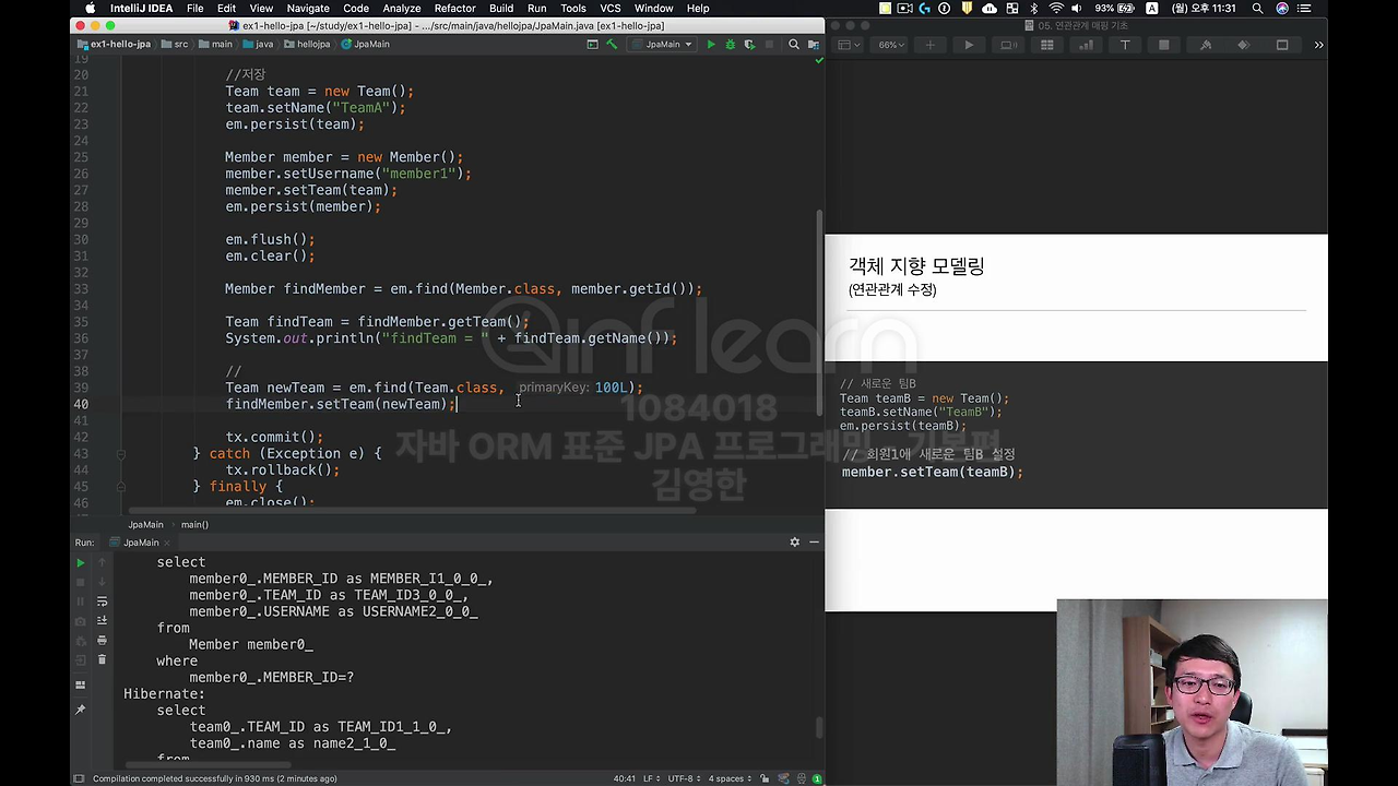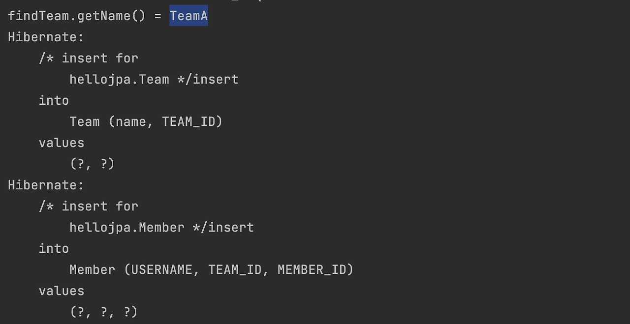 실행을 해보면 Insert 두 개가 제대로 나간걸 보실 수 있구요. 조회도 제대로 됩니다. 이런 식으로 해서 객체지향스럽게 바로 레퍼런스들을 가지고 오고 할 수 있다는 걸 확인해 보셨을 거에요. 지금 예제에서 보시면 실행했을 때 '어? select 쿼리가 왜 안나가지?' 이건 영속성 컨텍스트를 열심히 공부하시는 분들은 아시겠죠.