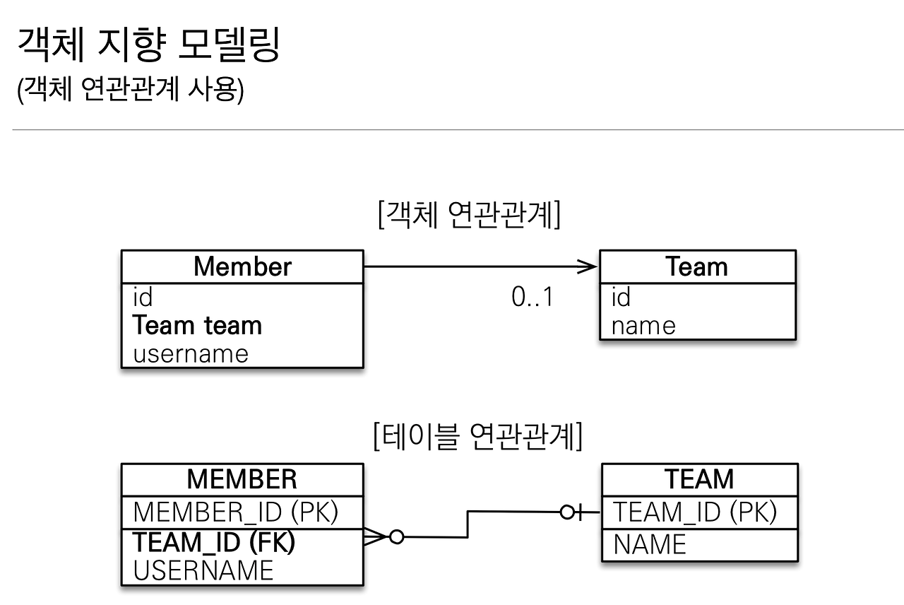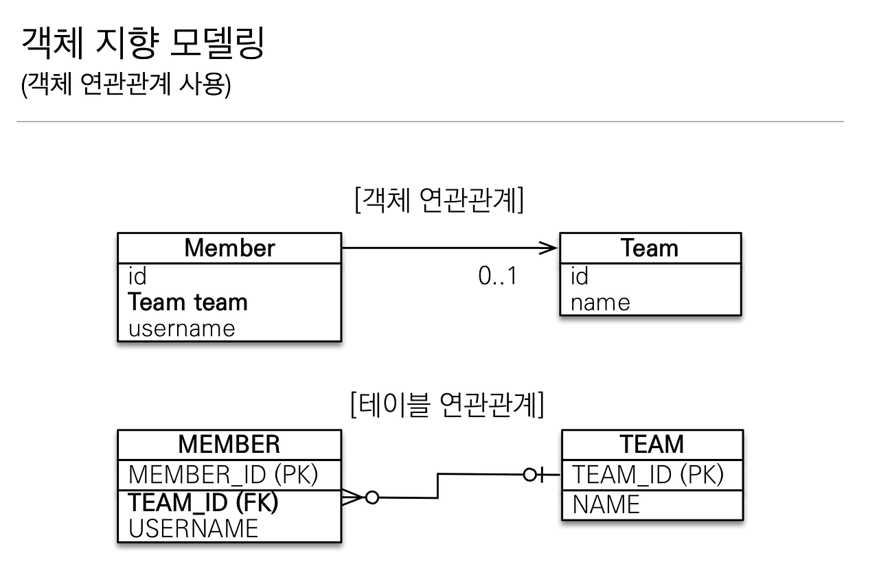 우선 객체와 테이블 연관관계의 차이를 이해를 해야 합니다. 왜냐하면 객체는 레퍼런스로 가잖아요. 지금 객체의 참조와 테이블의 외래 키를 맵핑하는 것을 배우는 거거든요.