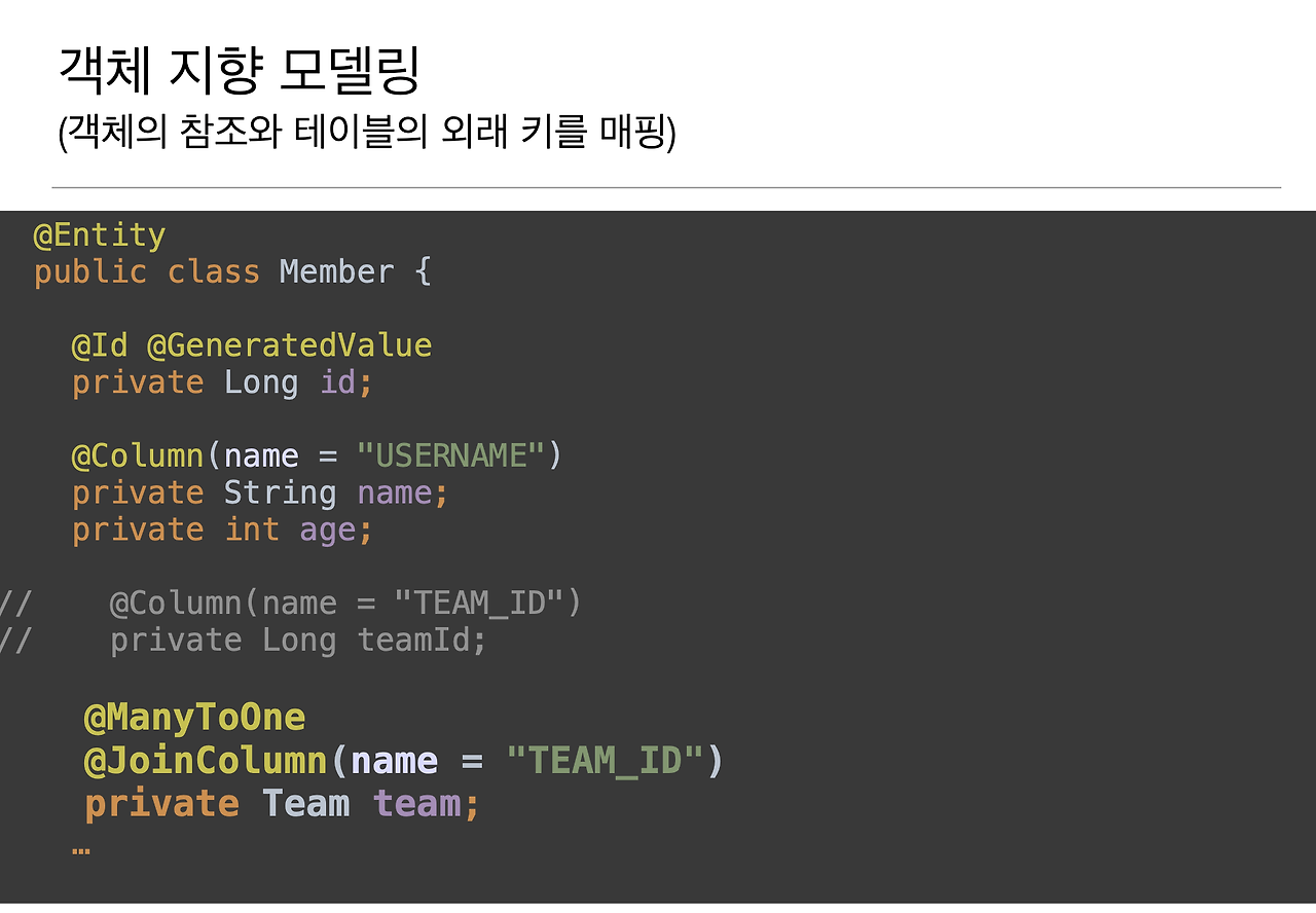 그래서 생각해보시면 객체는 레퍼런스란 말이에요. memer.getTeam 이런 식으로 가거나 member.Team 이렇게 레퍼런스로 쭉쭉 따라갈 수 있는데 테이블은 '나랑 연관된 애가 뭐지?'라고 할 때 외래 키 값을 이용합니다. 뭐 예를 들어서 주문 테이블에 있던, 이전 강의에서 보셨던 것처럼 주문 테이블 안에 memberId라던가 이런 것들이죠.