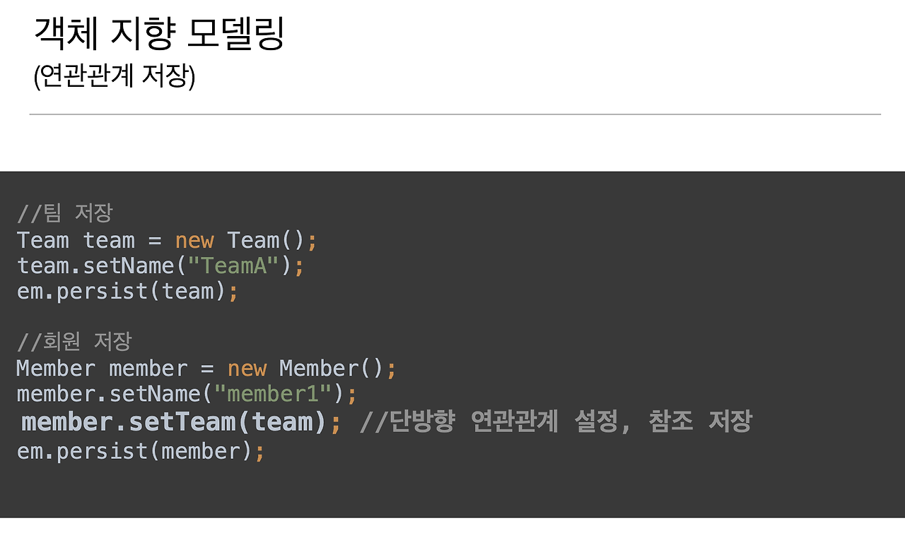 그러니까 객체는 이렇게 했는데 지금 보시면 이게 애매한 거에요. 이건 외래 키 식별자를 직접 다루는 거죠. 그리고 지금 상황에서 조회할 때도 이슈가 있는데