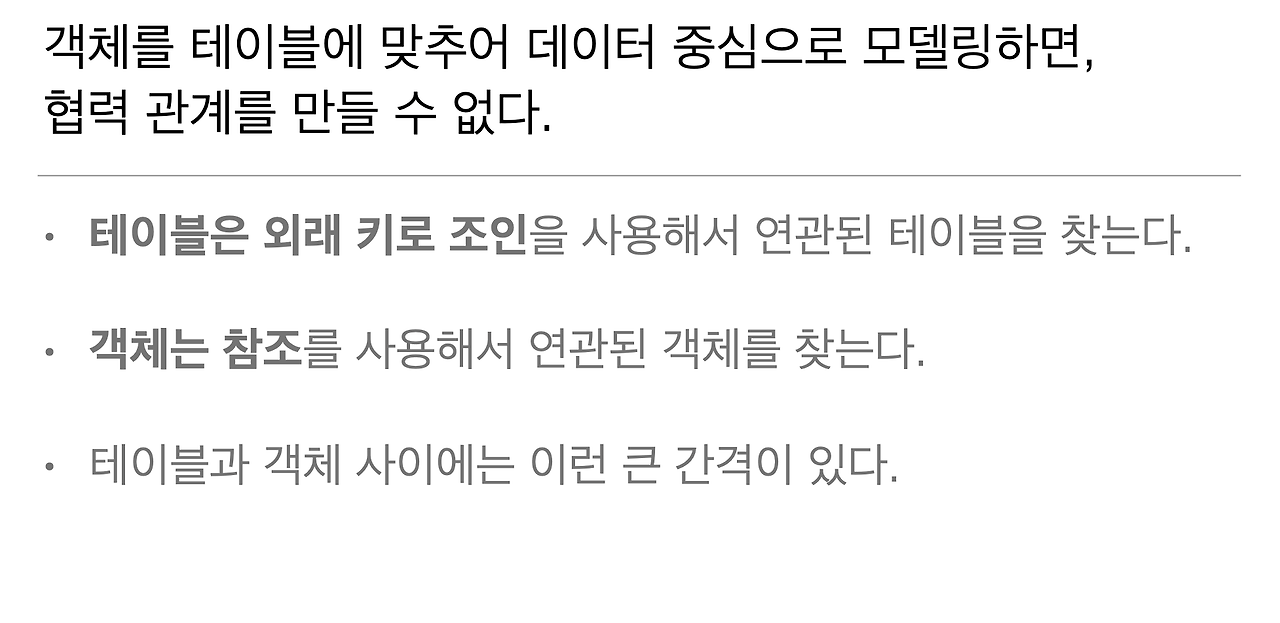 자 그래서 객체를 테이블에 맞춰 데이터 중심으로 모델링하면 협력관계를 만들 수가 없어요. 테이블은 외래 키로 조인을 해서 연관된 테이블을 찾아요. 방금 제가 조인 보여드렸죠. 그리고 객체는 참조를 사용해서 연관된 객체를 찾는단 말이에요. 테이블과 객체 사이에는 이런 큰 간격이 있어요. 외래 키 라는 거랑 참조는 완전히 다른 거죠.