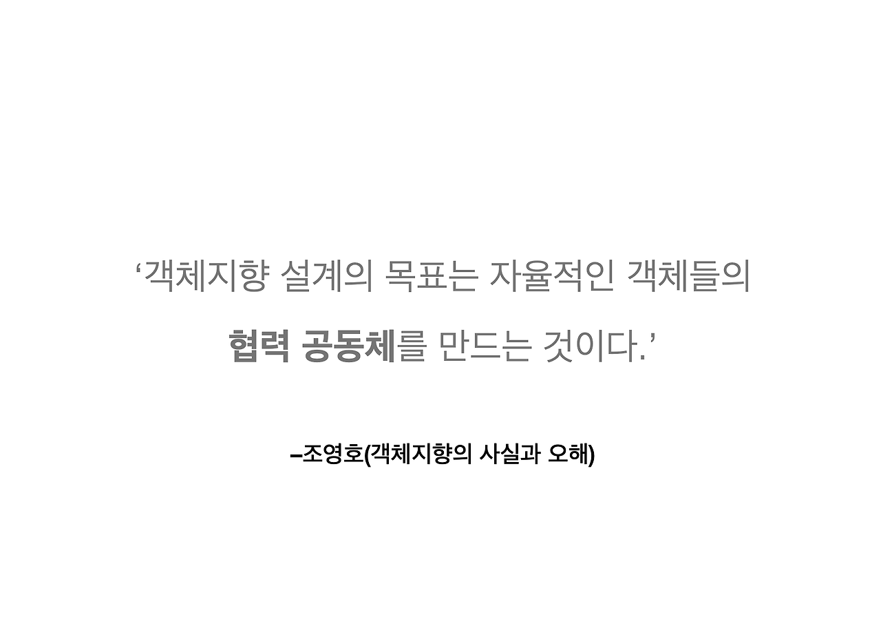 객체지향 설계의 목표는 자율적인 객체들의 협력 공동체를 만드는 것이다. 사실 테이블 하나로, 또는 객체 하나로 살아갈 수 있는 세상이 아니잖아요. 객체 같은 게 다 뭔가 연관관계에 걸려 있어 가지고 그것들을 뭐 이렇게 다 활용을 하는 거죠. 또 여기까지 왔으니
