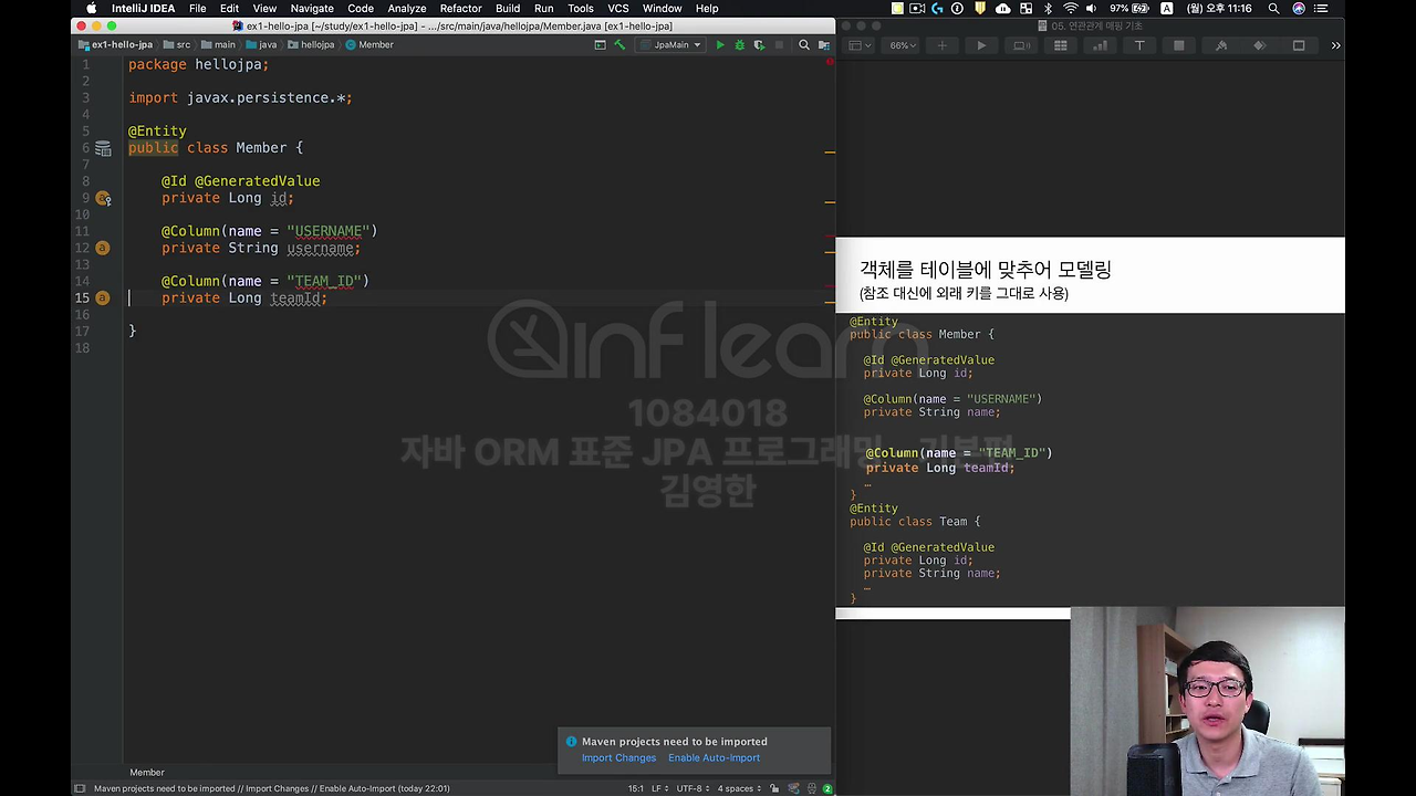 그 다음에 여기서 객체 Member의 team 레퍼런스랑 Member 테이블에 있는 team_id Foreign Key랑 맵핑을 해야되는 거예요.