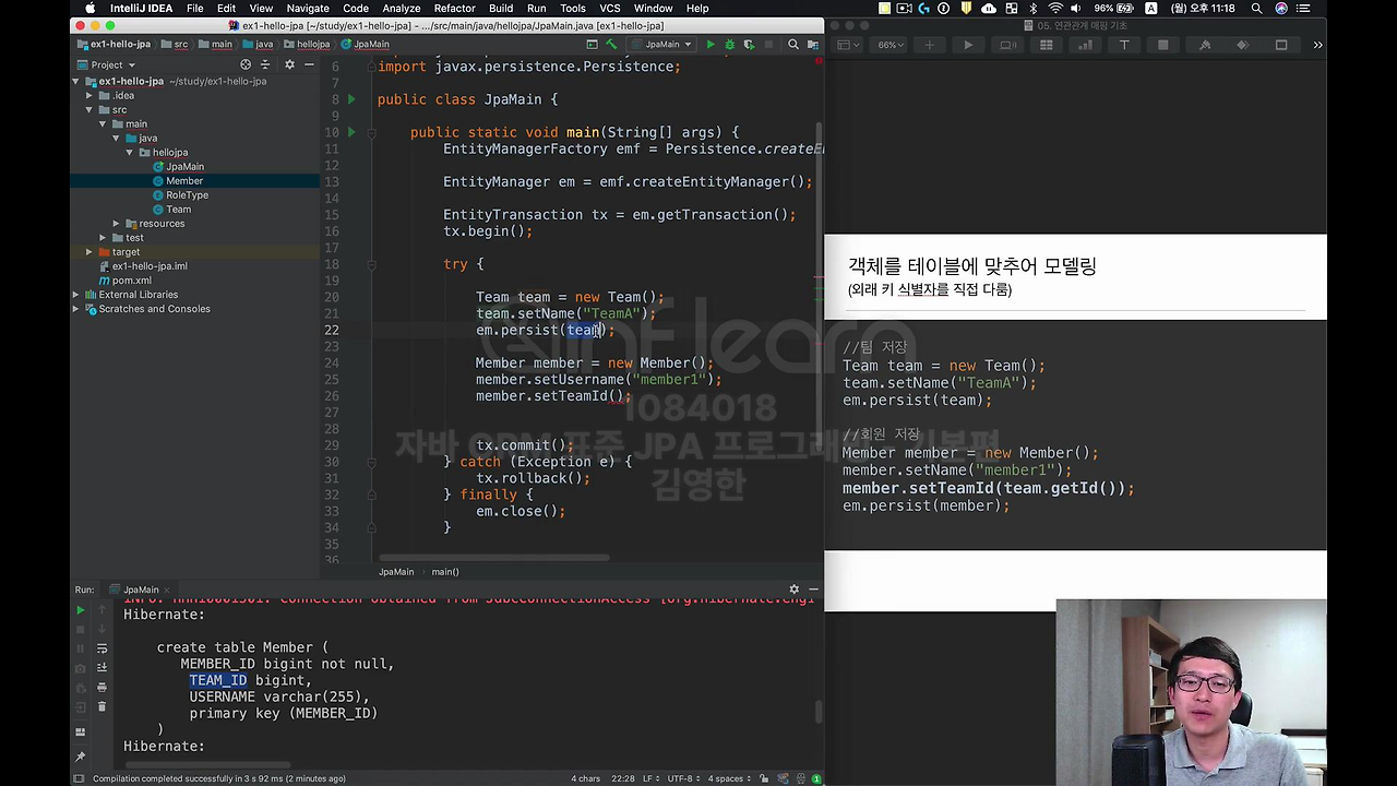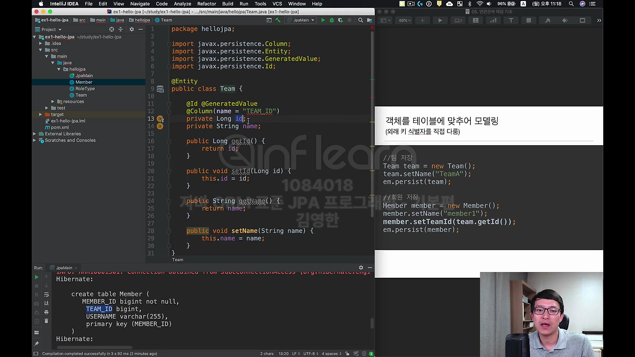 이게 좀 객체지향스럽지 않죠. setTeam 이라고 해야 될 것 같은데 지금까지 우리가 배운 거에서 아직 연관관계 맵핑을 안 배웠기 때문에 이렇게 하고 돌려보겠습니다.