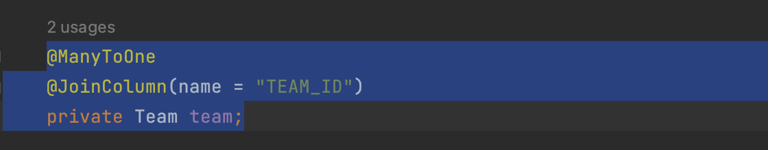이렇게 Team과 TEAM_ID Foreign Key를 연관관계 맵핑을 하는 겁니다. 이러면 사실 맵핑이 끝납니다. 그럼 이제 내가 마음껏 쓸 수가 있는 거에요.