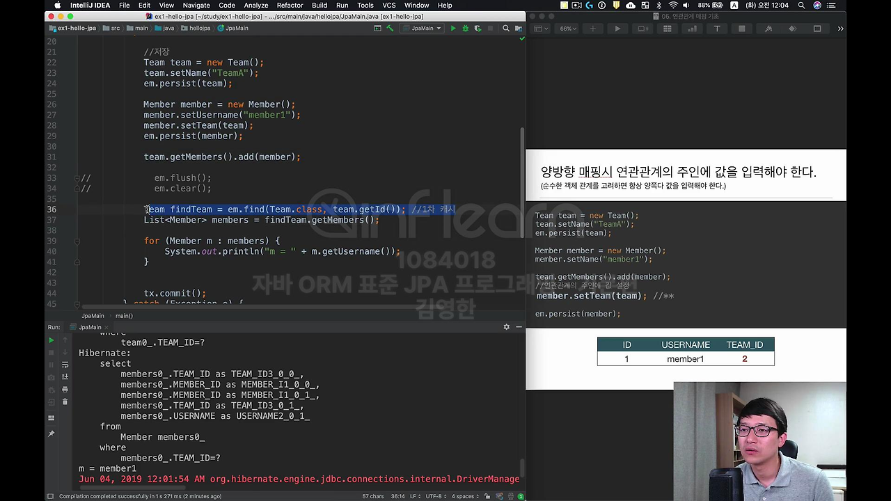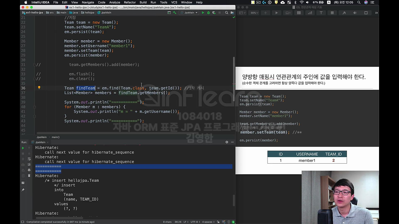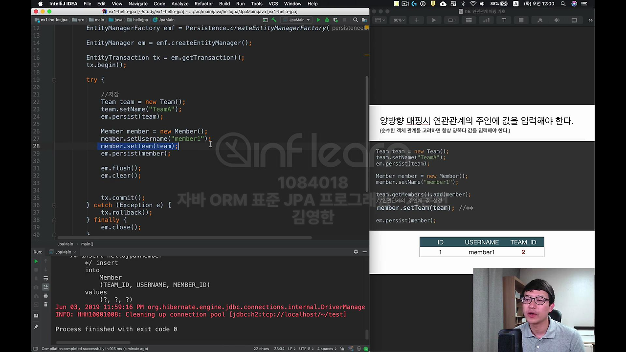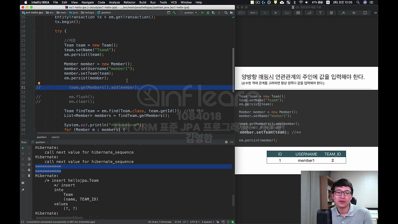 이번에는 연관관계의 주인에만 값을 넣어보고 연관관계의 주인이 아닌 건 주석처리 할 게요. 이렇게 하면 정상적으로 값이 들어갑니다. 지금 이 부분이 중요한 겁니다. 뭐 쿼리는 잘 나갔을 거고요.
