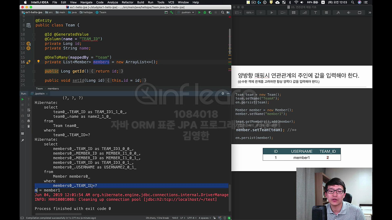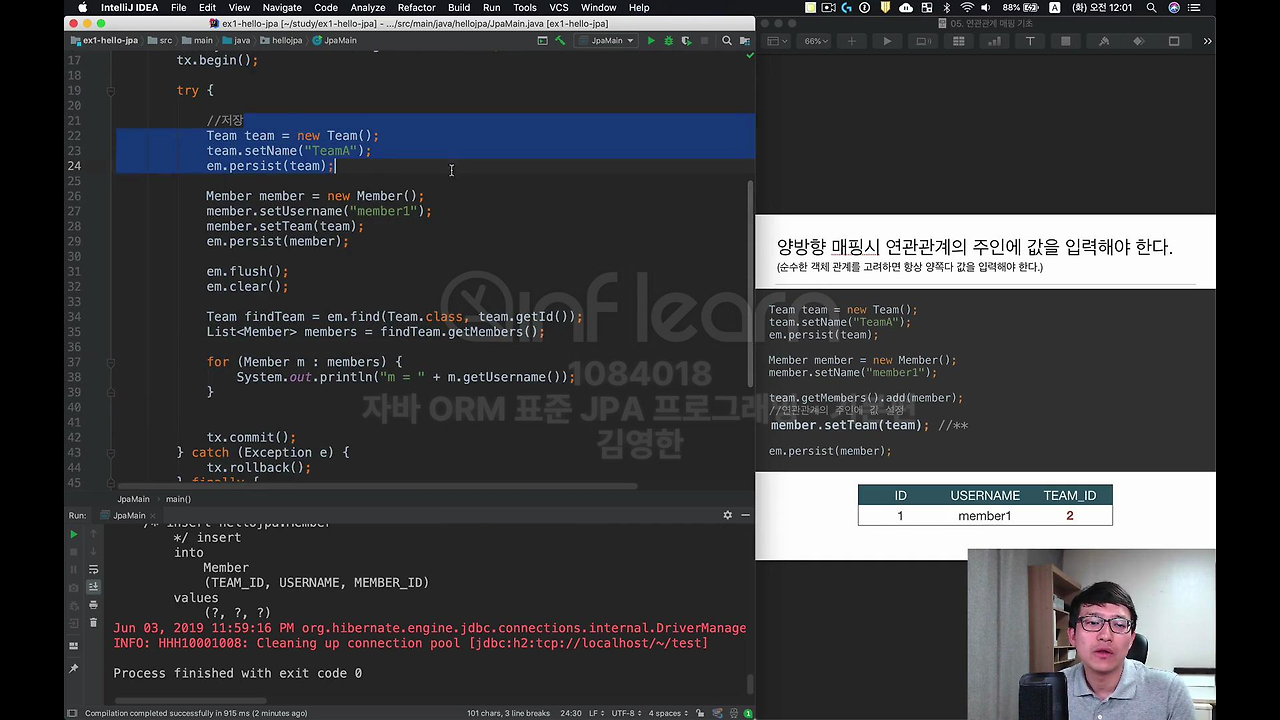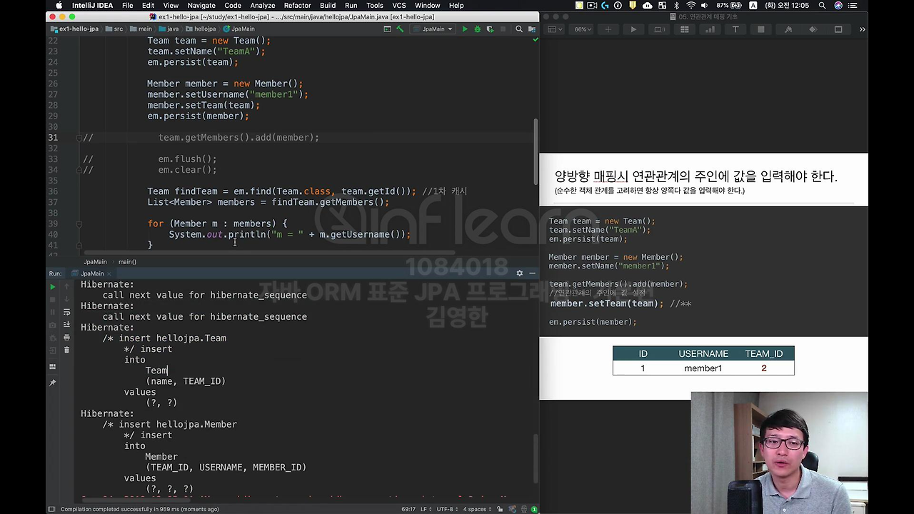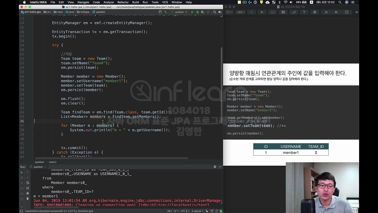 이번에는 연관관계의 주인에만 값을 넣어보고 연관관계의 주인이 아닌 건 주석처리 할 게요. 이렇게 하면 정상적으로 값이 들어갑니다. 지금 이 부분이 중요한 겁니다. 뭐 쿼리는 잘 나갔을 거고요.