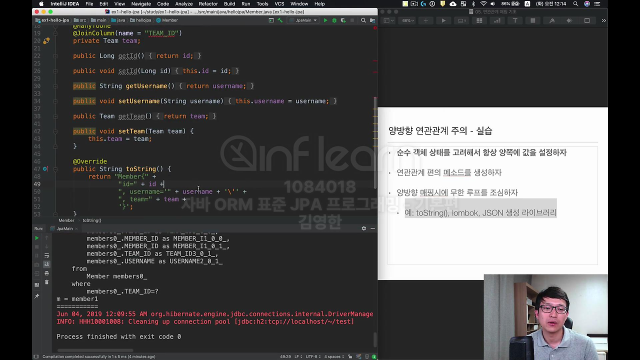 그리고 이제 조심해야 될게 양방향 맵핑 시에 무한 루프를 조심해야 됩니다. 뭐가 문제가 되냐면 lombok이나 JSON 생성 라이브러리에서 문제가 됩니다. 왜 문제가 되냐?