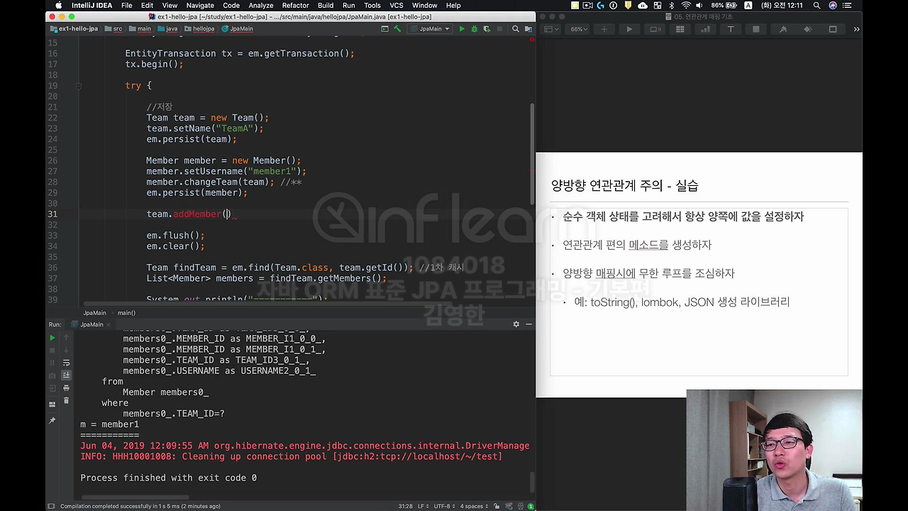 이렇게 하면 이제 Team에다가 addMember 해가지고 Member를 집어 넣으면 되죠. 그니까 둘중에 하나를 정하시면 돼요. 아까 말씀드렸던 연관관계의 주인 같은 경우에는