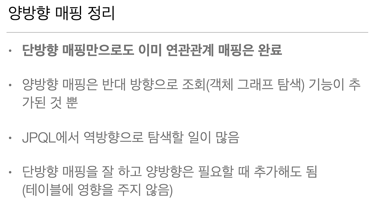 다시 말씀드리지만 객체 입장에서 볼 때 양방향 맵핑이라는 게 별로 크게 이득이 많이 되는게 없어요. 아무튼 저는 이렇게 정리를 해드리고요.