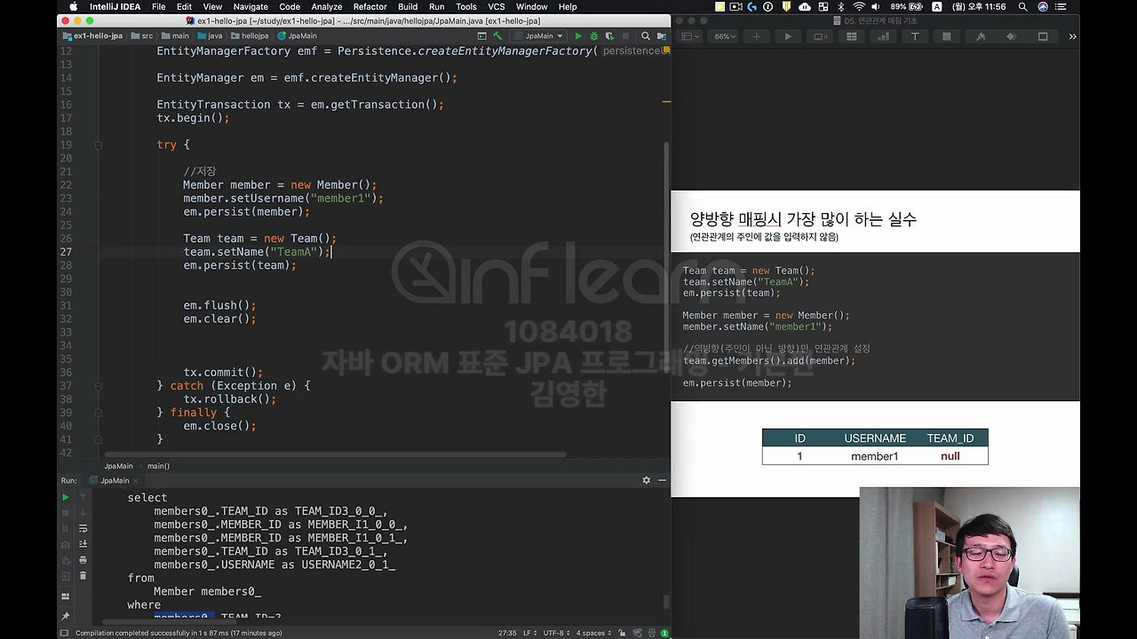 그래서 양방향 맵핑 시에 연관관계가 주인이 아닌, 역방향에만 값을 넣어가지고 외래 키 값이 null인 거. 이거를 제일 조심하셔야 됩니다. 분명히 이렇게 말씀드려도 운영에서 꼭 한번씩 실수를 합니다.