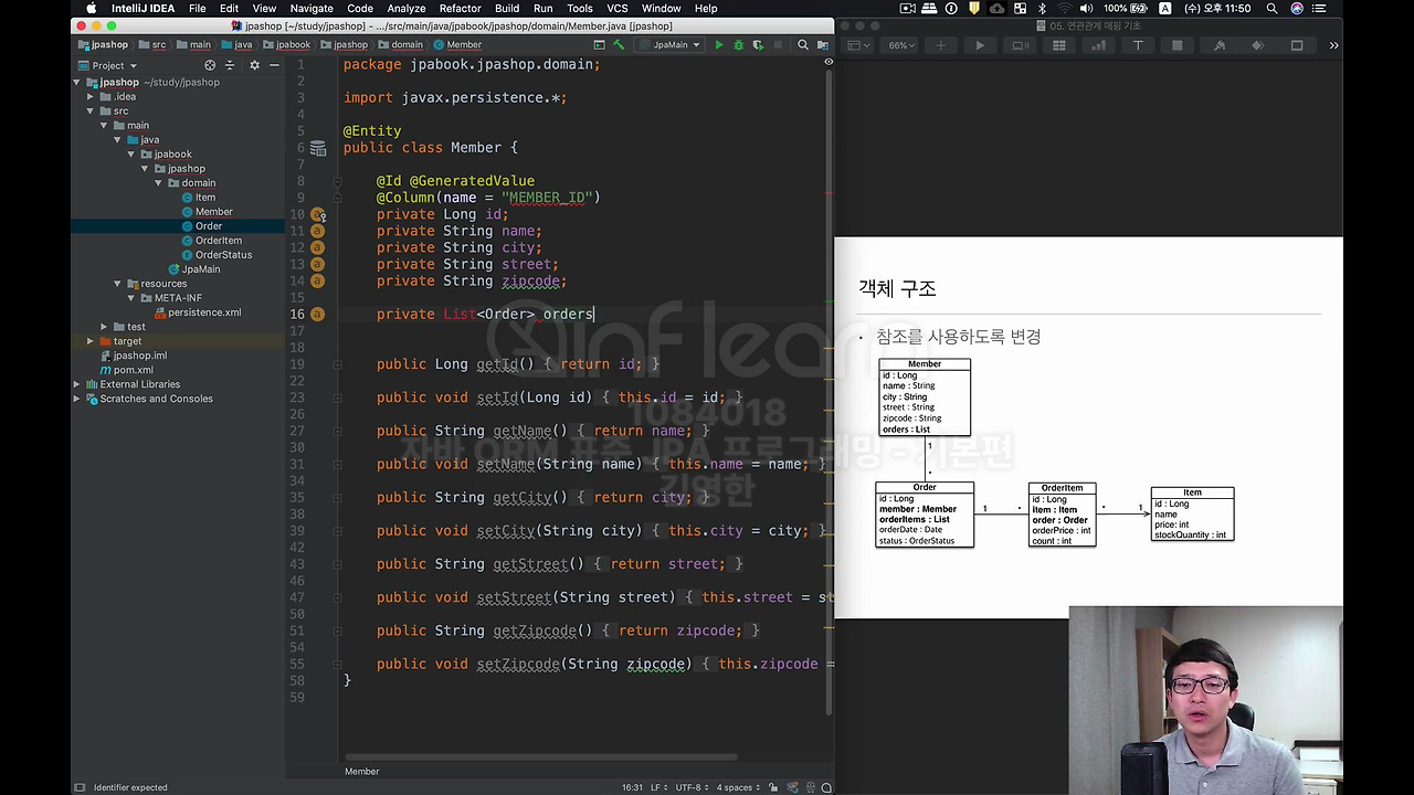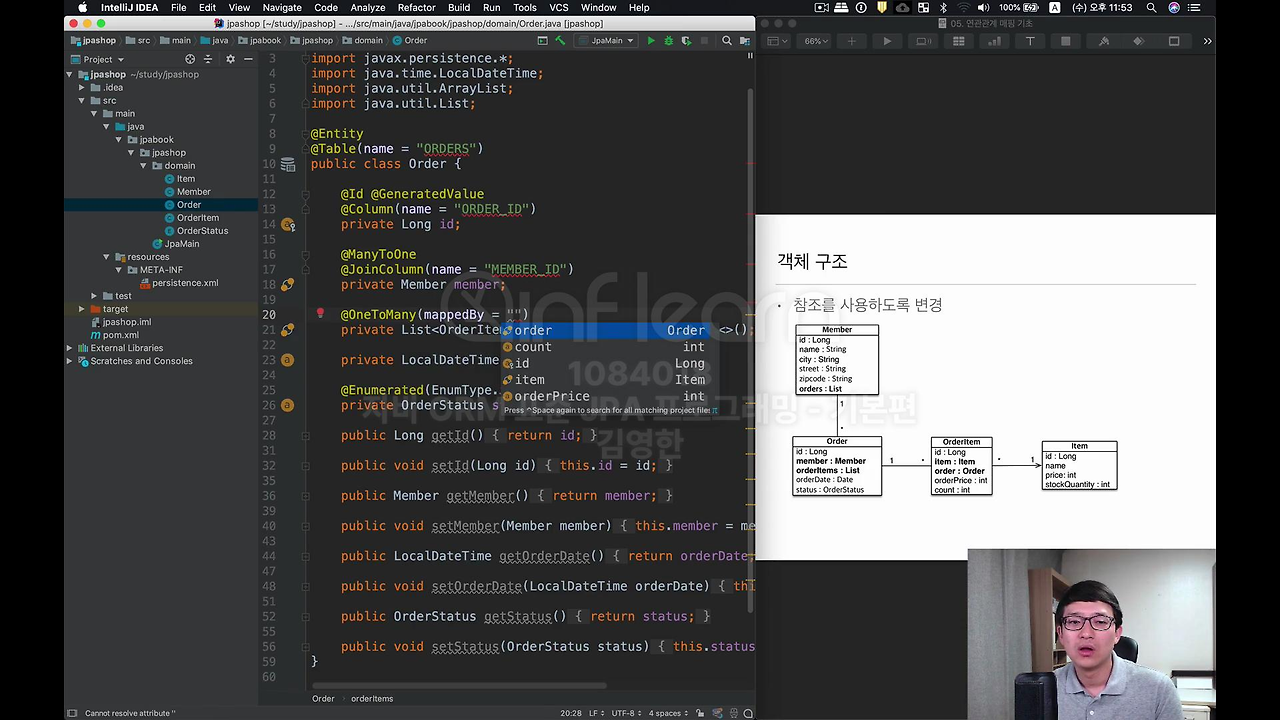 설명드렸듯이 중요한 건 이 단방향 연관관계만 돼도 애플리케이션은 그냥 커맨드성은 다 개발할 수가 있어요. 그런데 이제 orders나 orderItems 같은 List들을 써서 양방향 연관관계를 만드는 이유는 어떤 개발상의 편의 등의 이유로 나중에 조회할 때 만드는 거지, 말씀드렸듯이 이제 연관관계 주인이 아닌 거는 할 수 있는 게 조회밖에 없거든요.