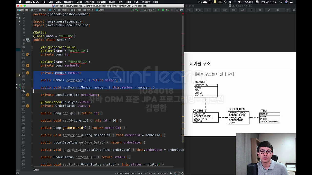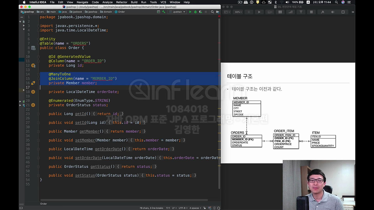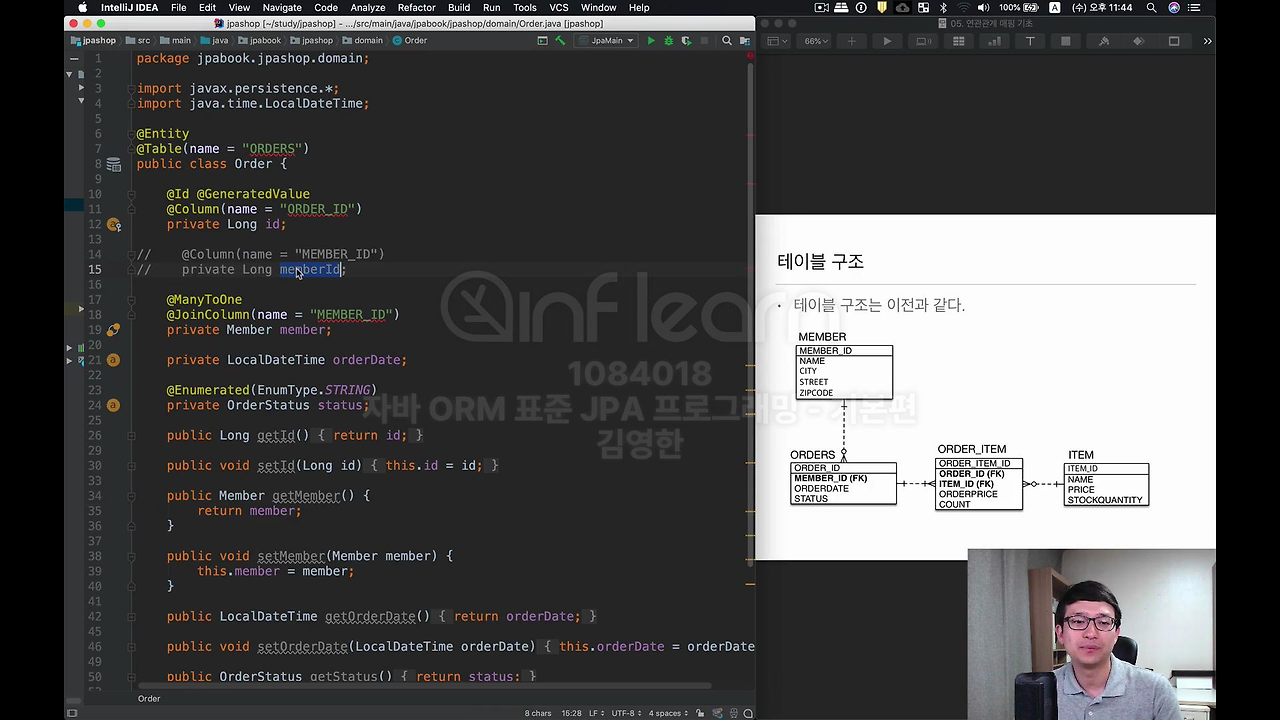 지금 OrderItem에 있는 여기 order 거든요. 이게 연관관계 주인이 돼야 돼요. ORDER_ID랑 딱 맵핑이 돼있기 때문에