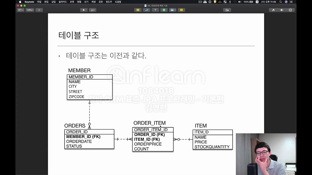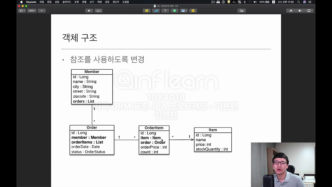 자 그 다음에 여기 보시면 테이블 구조에서 ORDER_ITEM 입장에서 ITEM과의 관계는 ORDER_ITEM이 다이고 ITEM이 1이죠.