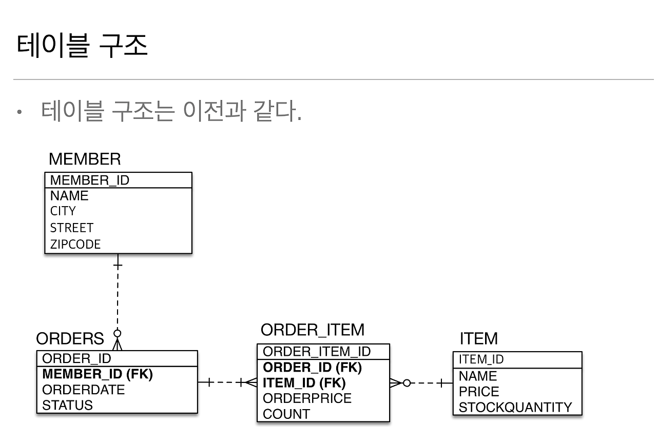 보시면 기존과 테이블 구조는 완전히 동일하고요. 하나의 Member가 여러 개의 주문을 할 수 있는 일대다 구조고, 주문과 아이템이 있는데 하나의 주문이 여러 개의 아이템을 주문할 수 있기 때문에, 다대다를 일대다, 다대일로 풀어낸 ORDER_ITEM 이라는 테이블이 있습니다. 그래서 실전 예제 1번이랑 테이블 구조는 완전히 동일합니다.