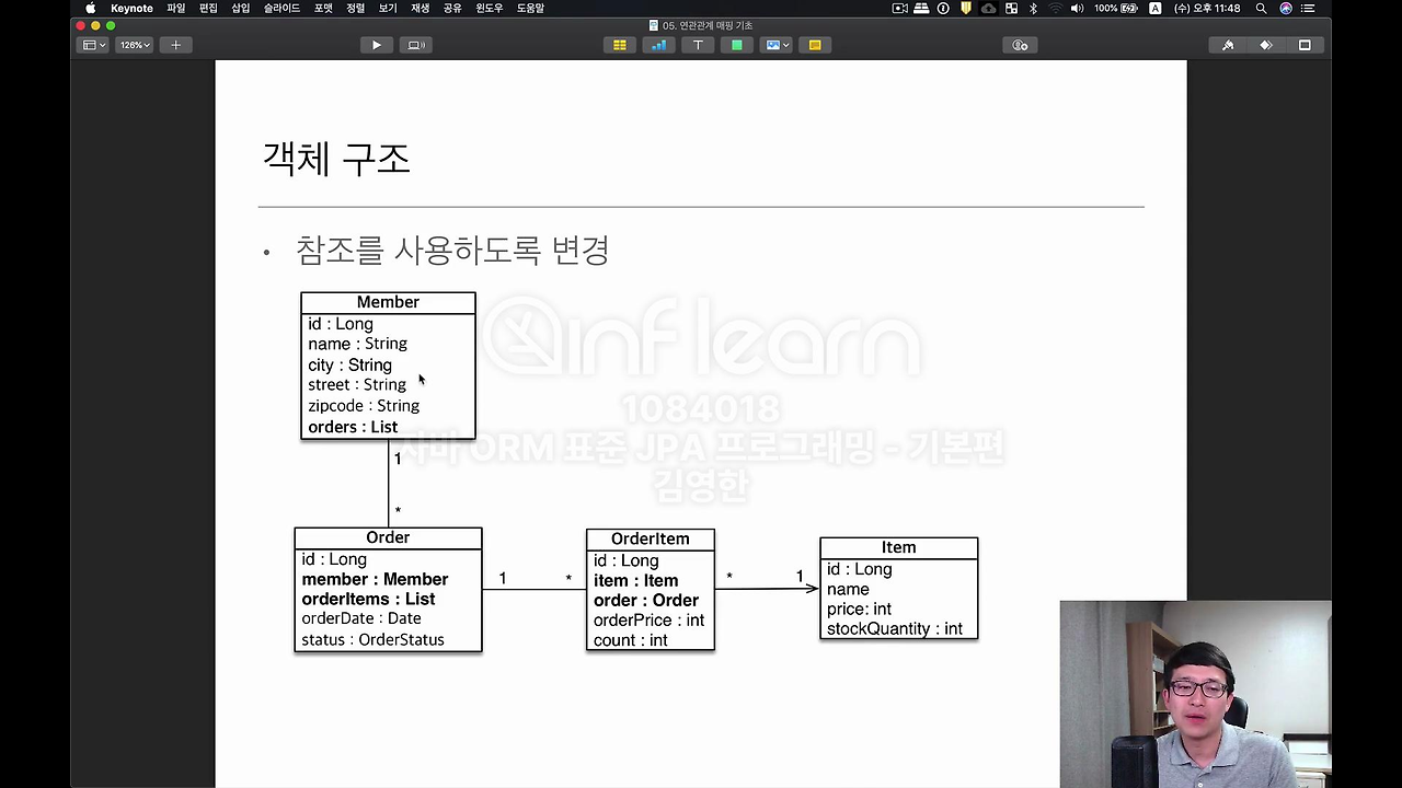 그러니까 막 이게 객체 지향이라고 해서 머릿속으로 생각할 때는 회원 입장에서 주문을 가야겠지? 뭘 해야지 하면 사실 이게 끝이 안 나요. 여기서 잘 끊어내는 게 설계에서 되게 중요하거든요. 특히 연관관계를 잘 끊어내는 게 되게 중요한데 회원은 그냥 거의 회원만 가지고 있으면 돼요. 주문이 필요하면 주문으로부터 시작을 하면 되는 거죠. 쿼리 입장에서 생각해봐도 JPQL 같이 나중에 그런 걸 짜셔도 할 수 있거든요. Order 파라미터에 Member를 그대로 넘길 수 있어요. 이것만 알면 되는 거지 Member가 굳이 Orders를 알 필요는 거의 없는 거예요. Order부터 시작하면 되는거죠.