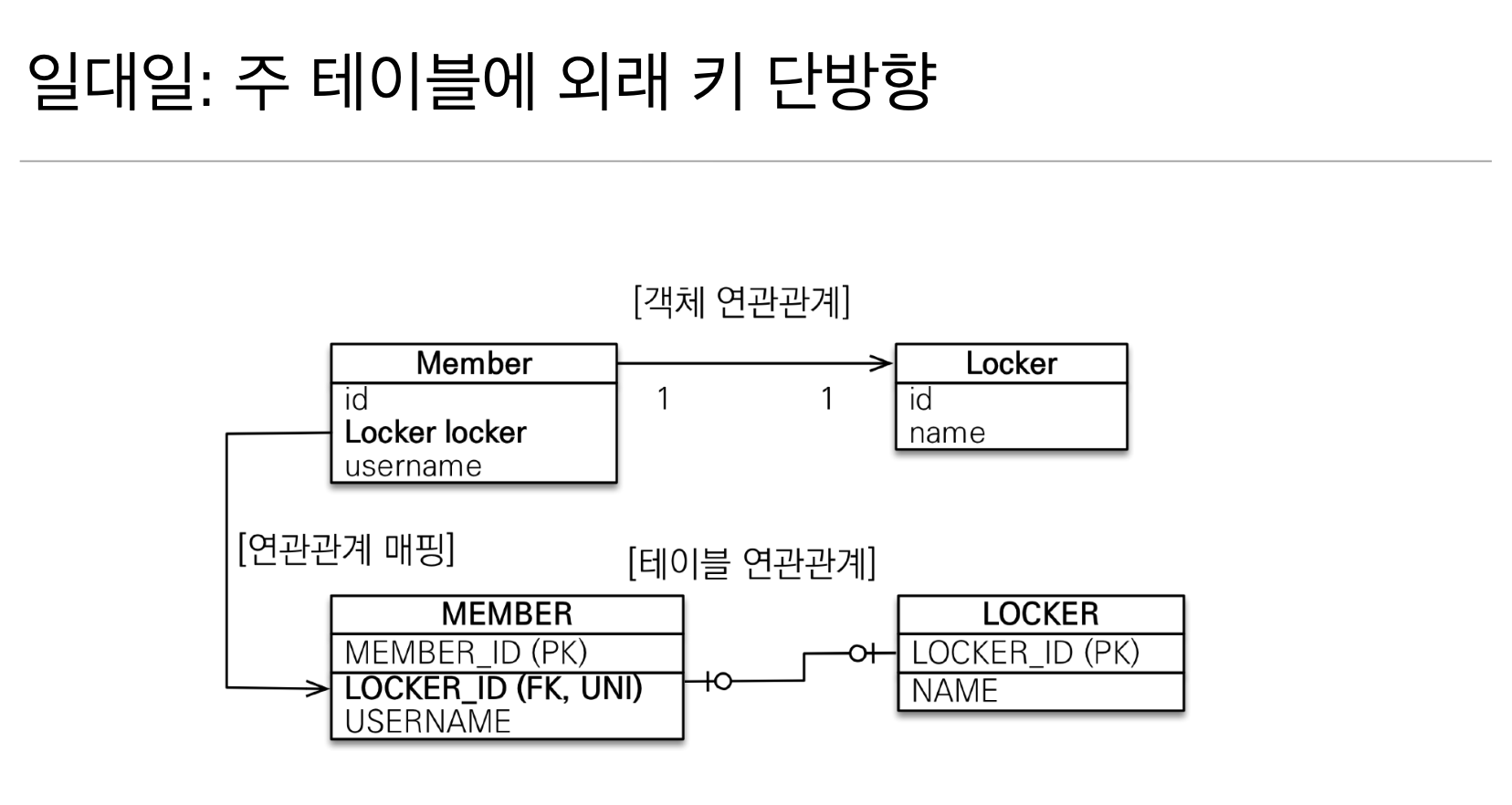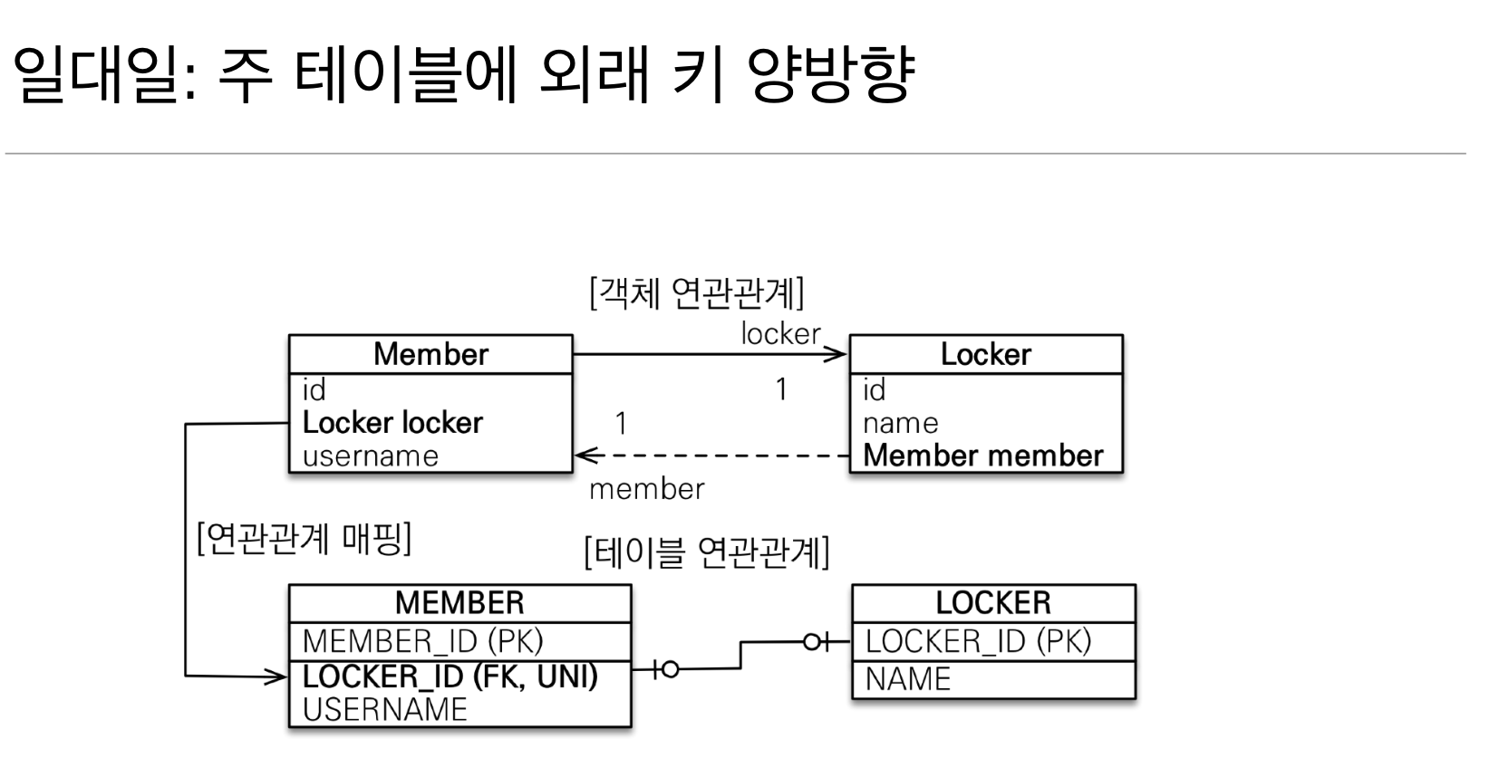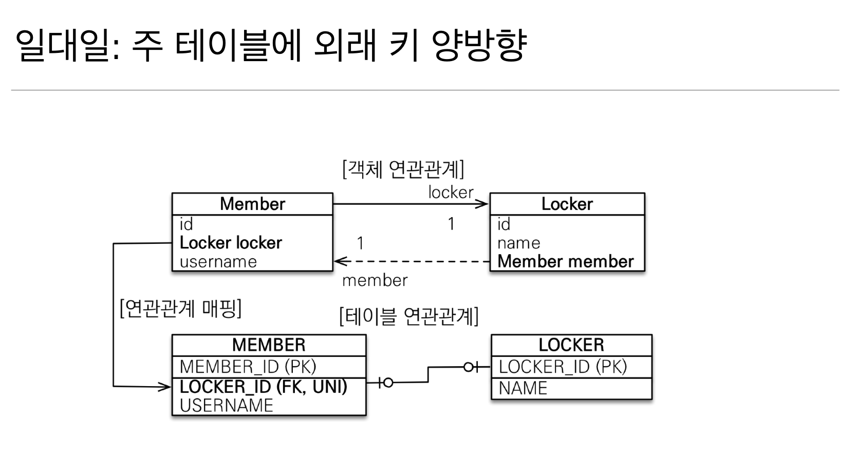 처음으로 올라가서 JPA 입장에서는 Member를 로딩할 때 이 Locker의 값이 있는지, 없는지 이 Foreign Key(외래키)에 값이 들어있으면 locker에 값이 있다고 가정할 거고 값이 없으면 locker에 null을 딱 집어 넣어주면 돼요. JPA 입장에서 그게 되게 심플하단 말이에요. MEMBER 테이블만 쿼리하면 돼요.