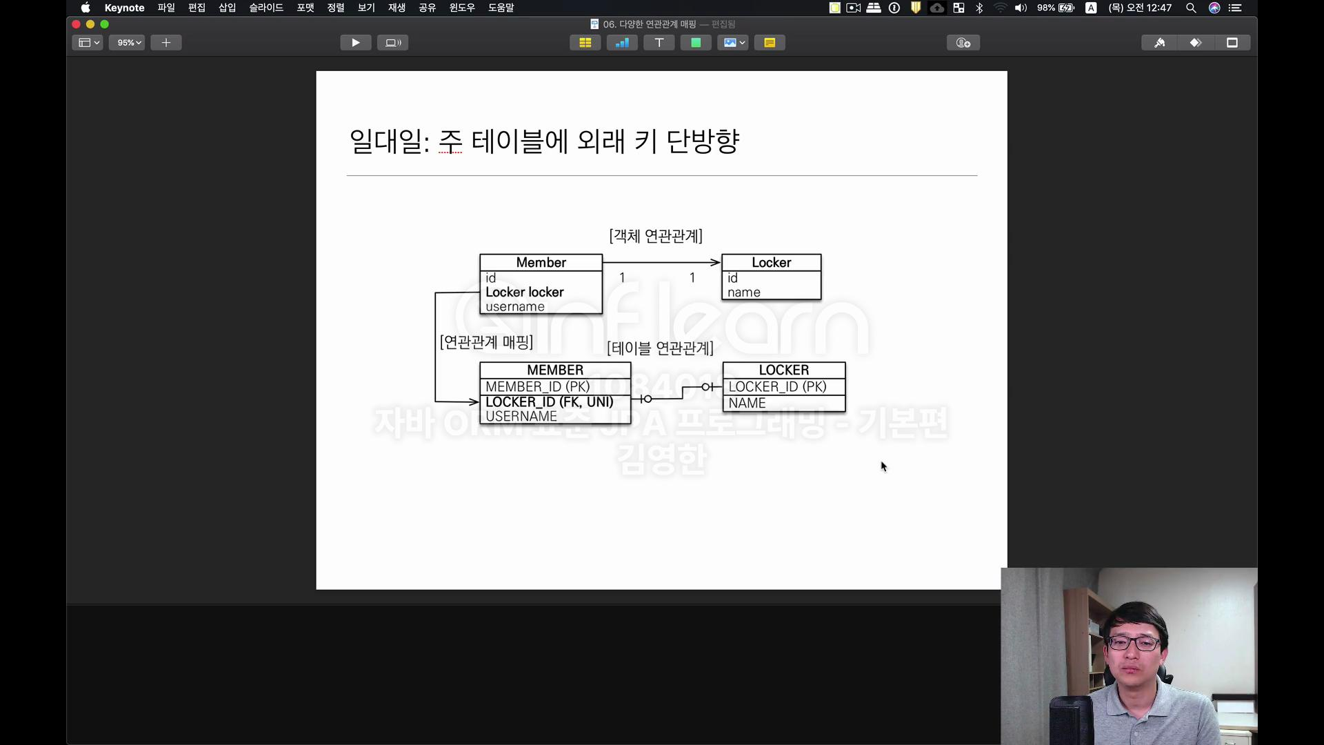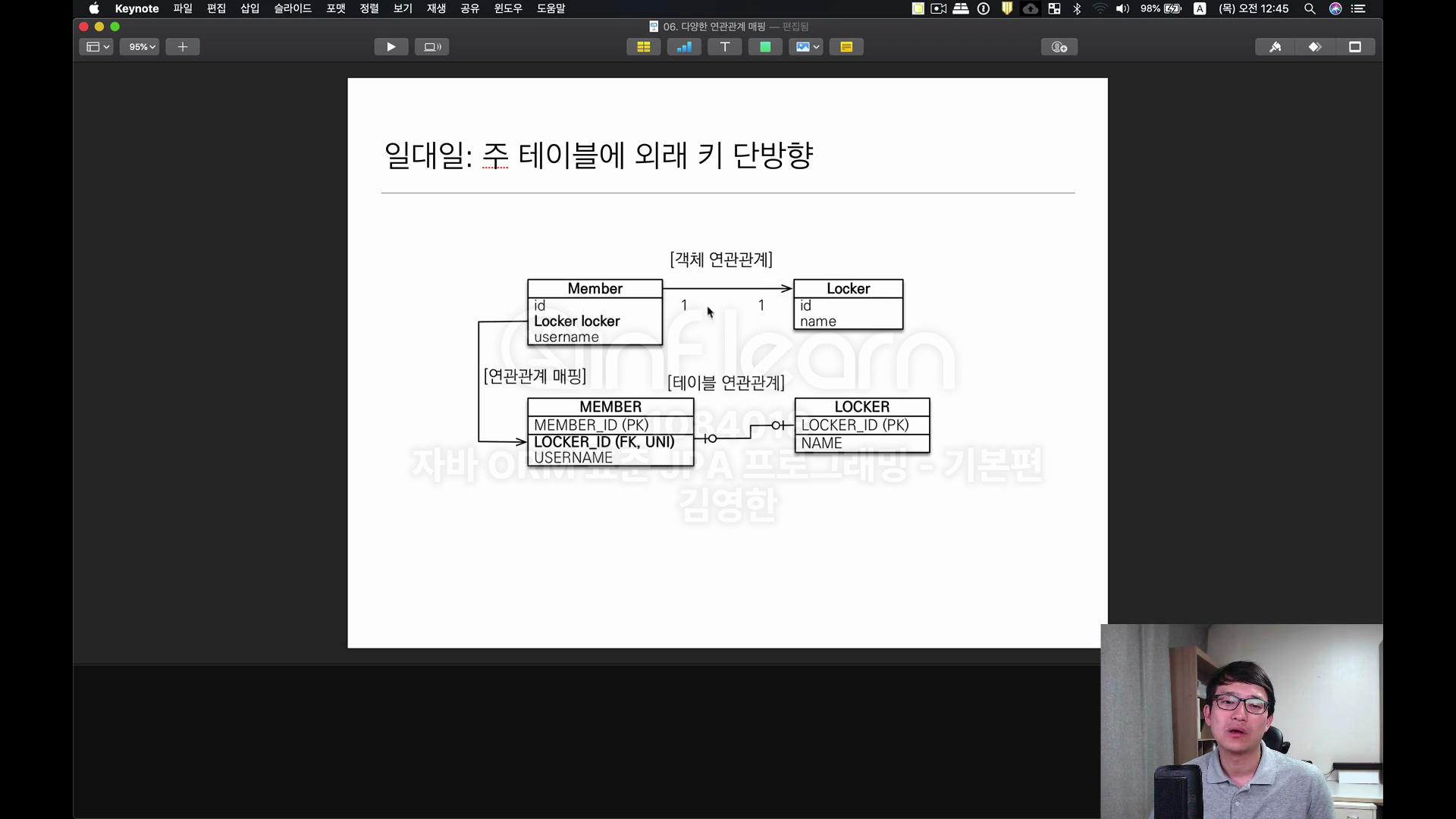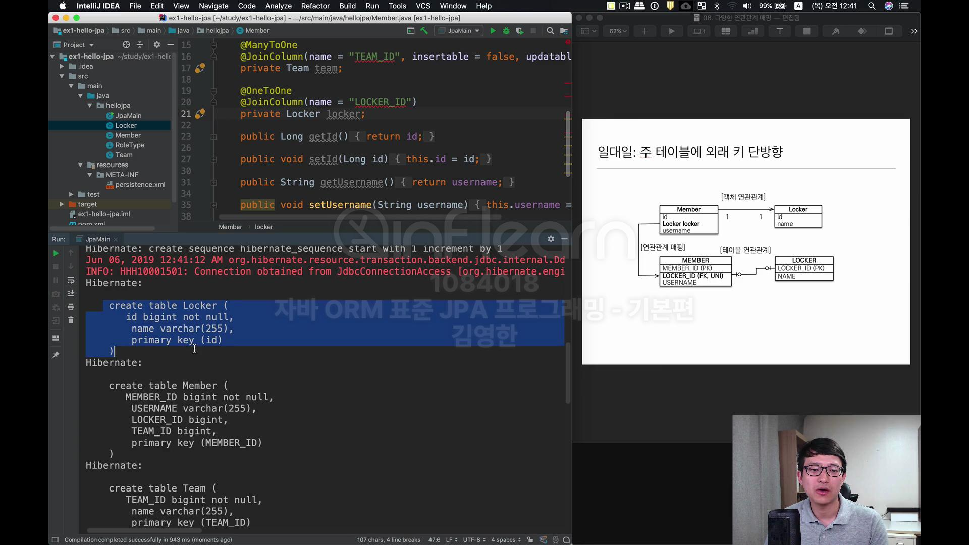 처음으로 올라가서 JPA 입장에서는 Member를 로딩할 때 이 Locker의 값이 있는지, 없는지 이 Foreign Key(외래키)에 값이 들어있으면 locker에 값이 있다고 가정할 거고 값이 없으면 locker에 null을 딱 집어 넣어주면 돼요. JPA 입장에서 그게 되게 심플하단 말이에요. MEMBER 테이블만 쿼리하면 돼요.