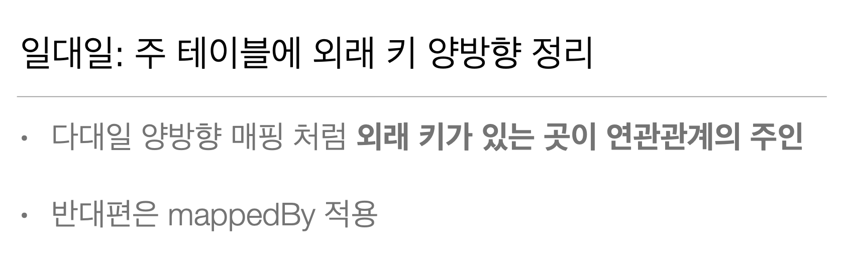 다대일 양방향 맵핑처럼 외래키가 있는 곳이 연관관계의 주인입니다. 반대편은 mappedBy를 적용해 주시면 됩니다.