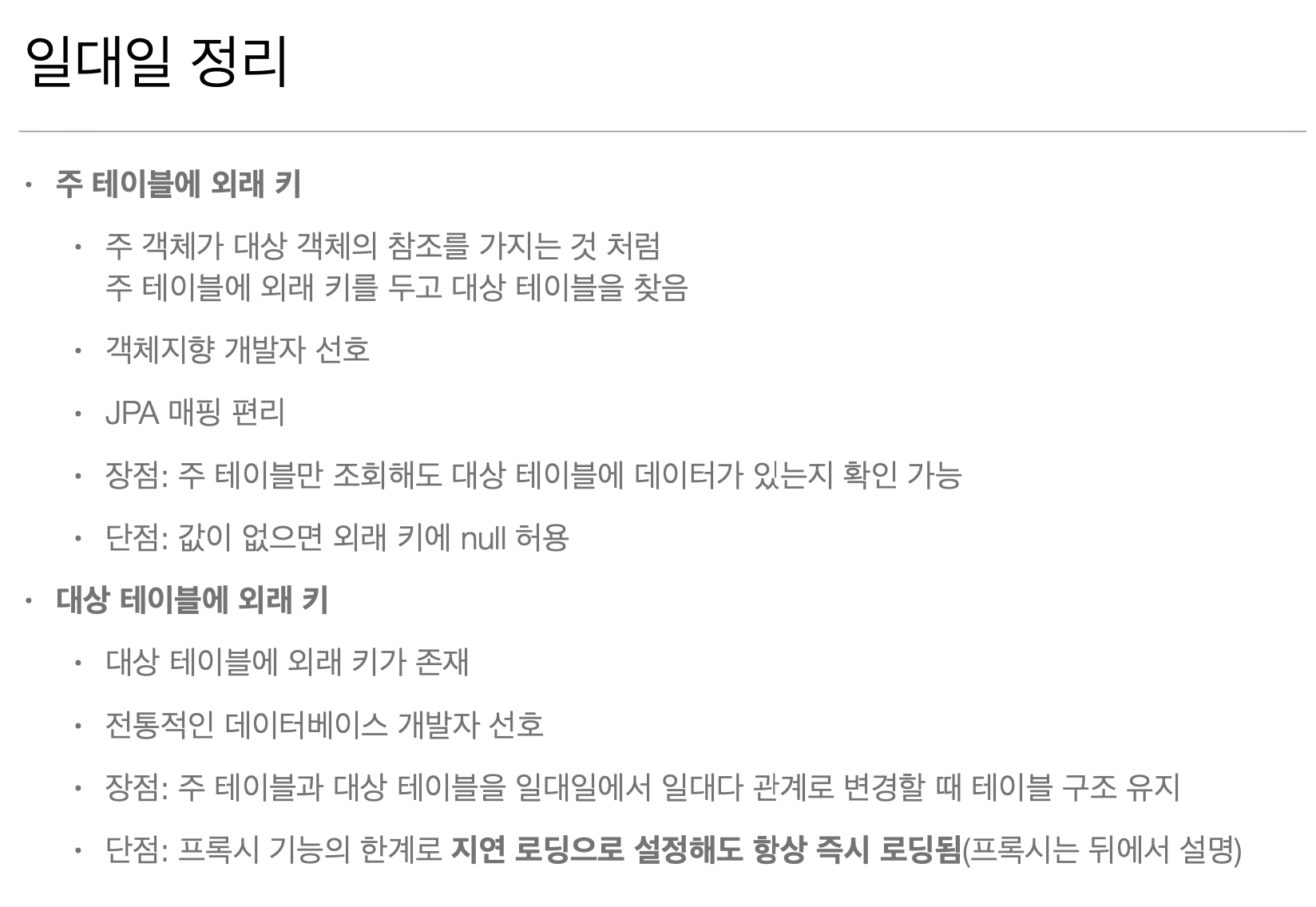 아무튼 그래서 주 테이블에 외래키를 두는 것의 장점은 주 테이블은 주로 많이 액세스하는 테이블이라고 정의했다고 보시면 되고요. 주 객체가 대상 객체의 참조를 가지는 것처럼 주 테이블에 외래키를 두고 대상 테이블을 찾는단 말이에요. 이거는 객체지향 개발자들이 보통 선호를 해요. 그리고 JPA 맵핑이 편리하고요. 장점은 주 테이블만 조회해도 대상 테이블에 데이터가 있는지 확인 가능해요. 단점은 참조 값이 없으면 외래키에 NULL을 허용해야 되는데 이게 DBA 입장에서는 좀 치명적이죠. 어떻게 보면 좀 순수하게 가시는 분들은 약간 치명적일 수 있어요.