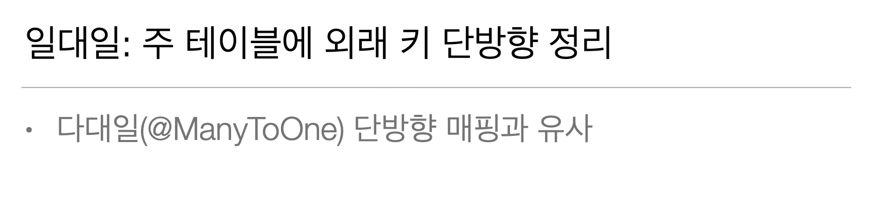 저는 그래서 사실 실무에서는 거의 이 방법을 씁니다. 이렇게 주 테이블에 외래키가 있는 방향을 선호합니다. 근데 이거는 dba 분들이 싫어할 수 있기 때문에 충분히 협의가 돼야 됩니다.