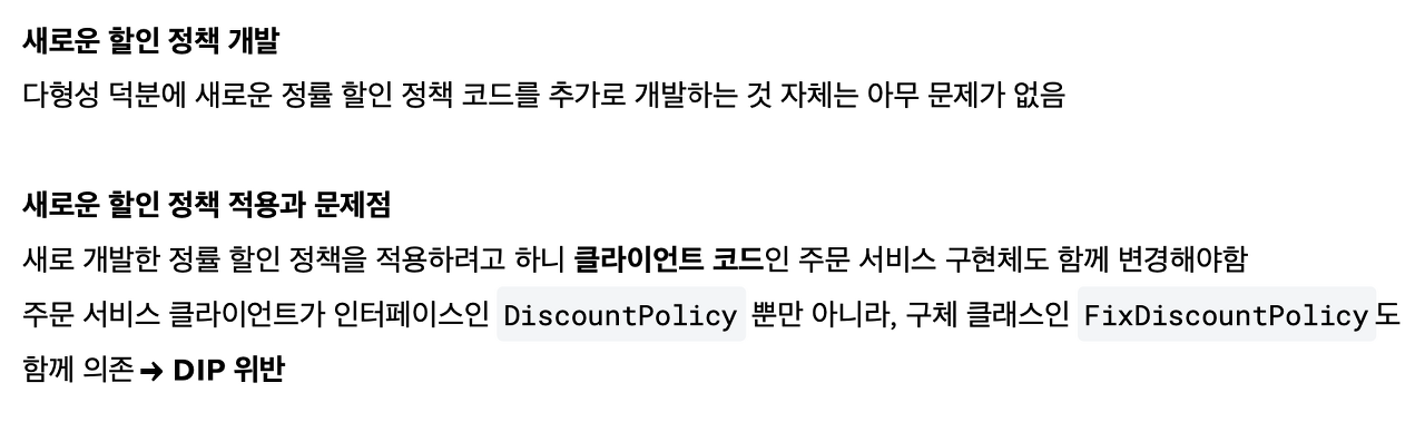 왜냐하면 주문 서비스 클라이언트가 인터페이스인 DiscountPolicy뿐만 아니라 구체 클래스인 FixDiscountPolicy도 함께 의존하고 있었기 때문에 그래요. 이거는 DIP를 위반하는 거죠. 추상화에만 의존해야 되는데 구체적인 것까지 의존을 하고 있었던 거죠.