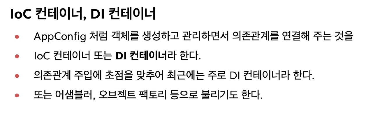 IoC 컨테이너, DI 컨테이너라는 용어가 나오는데요. 스프링의 DI 컨테이너라는 게 AppConfig의 역할을 해주는 거예요.