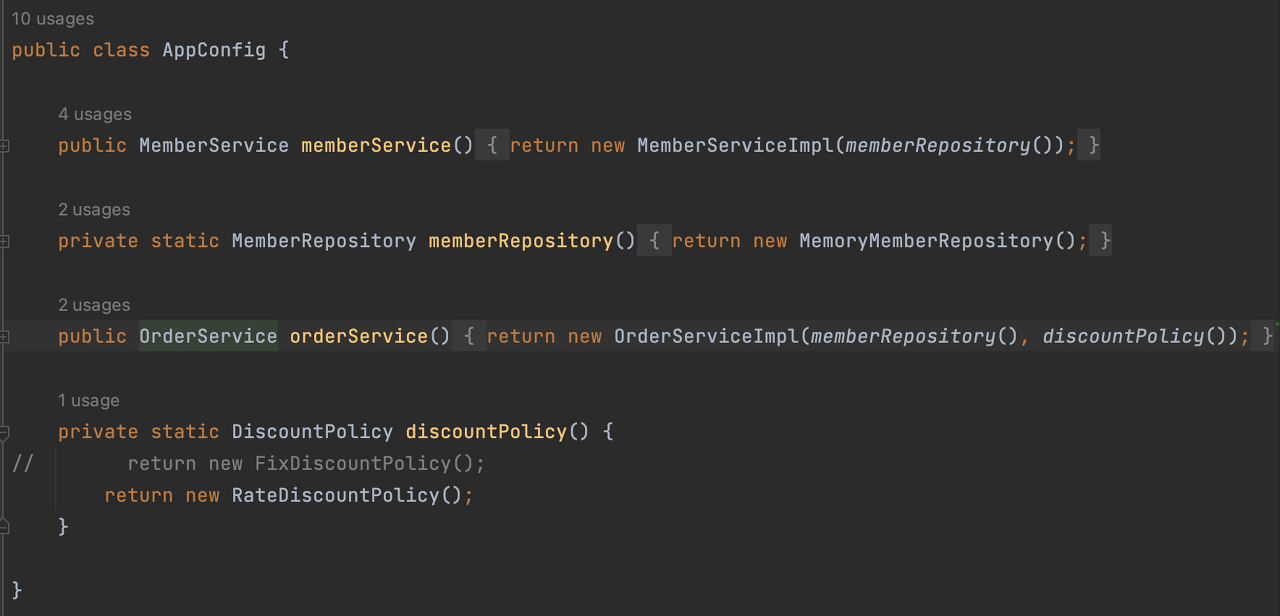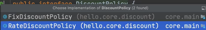MemoryMemberRepository랑 RateDiscountPolicy가 결과적으로 들어갑니다.