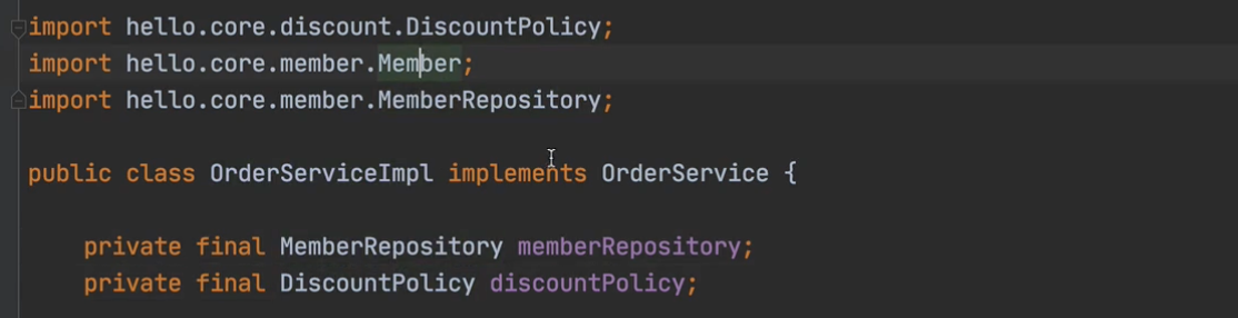 그리고 OrderServiceImpl은 MemberRepository 인터페이스와 DiscountPolicy 인터페이스를 참조하고 있죠.