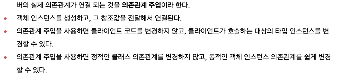 그래서 이렇게 정적인 클래스 의존관계와 실행시점에 결정되는 동적인 객체 의존관계를 분리해서 생각해야 합니다.