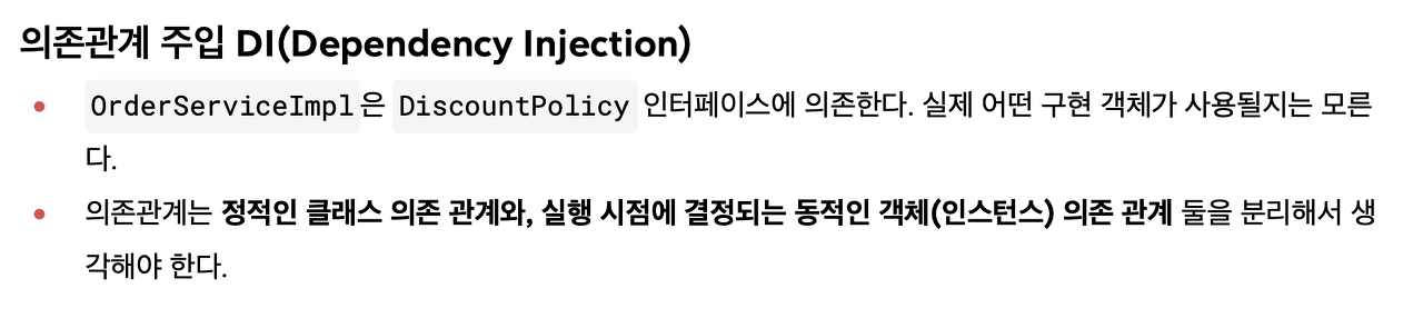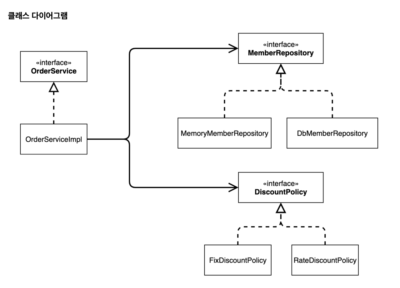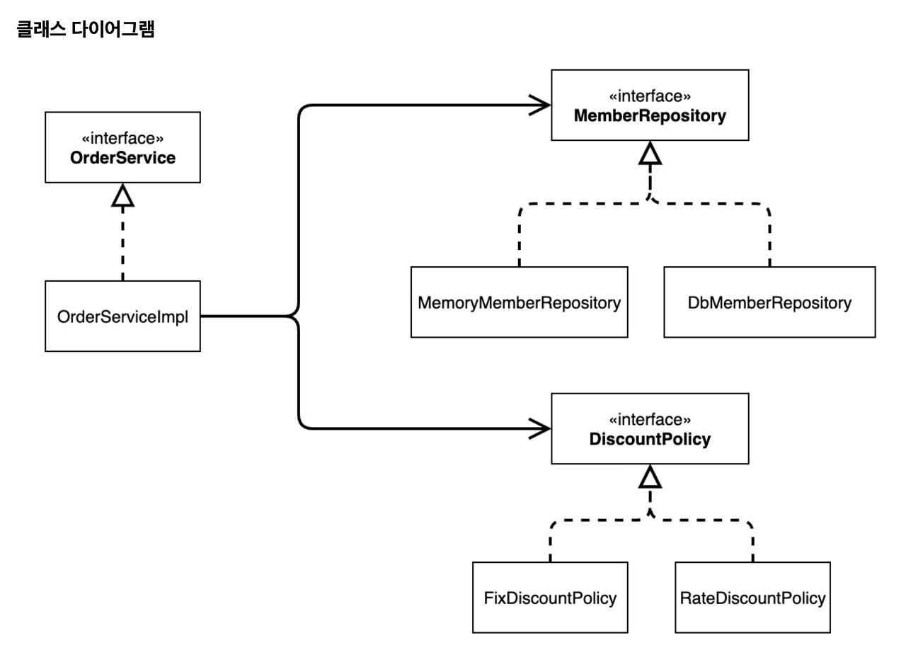 아무튼 OrderServiceImpl은 MemberRepository, DiscountPolicy에 의존한다는 것을 알 수 있습니다. 그런데 이러한 클래스 의존관계만으로는 실제 어떤 객체가 OrderServiceImpl에 주입 될지는 알 수가 없죠.