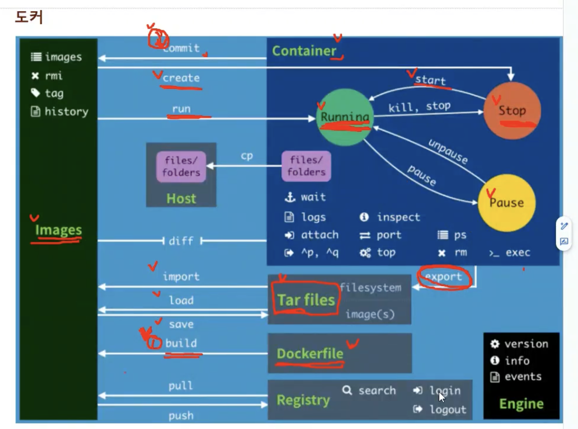 - 도커 API 서버가 실제로 그 명령을 받아서 도커 데몬(백엔드)에게 전달하고, 도커 데몬이 작업을 실행해요.