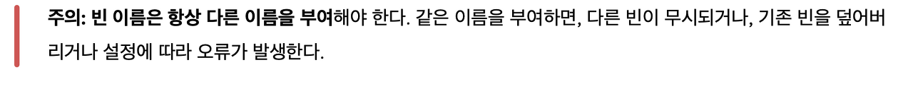 그런데 주의할 게 있어요. 빈 이름은 항상 다른 이름을 부여해야 돼요. 같은 이름을 부여하면 상황에 따라 빈의 이름이 무시되거나 기존 빈을 덮어버리거나, 설정에 따라서 오류가 발생하기도 해요.