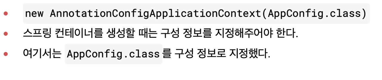 스프링 컨테이너를 생성할 때는 이 AppConfig 라는 구성(설정) 정보를 지정을 해줘야 돼요. 그래서 파라미터로 AppConfig.class를 넘긴 거에요.