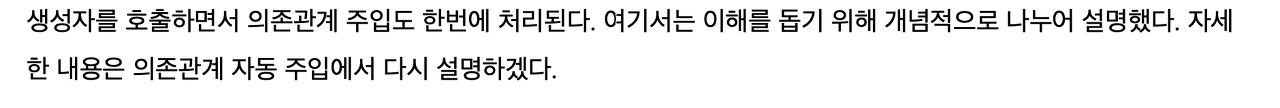 그런데 실제 스프링의 라이프 사이클은 빈 생성과 의존관계의 단계가 나누어져 있거든요. 뒤에서 설명하면 왜 나눠설명했는지 아실 겁니다.