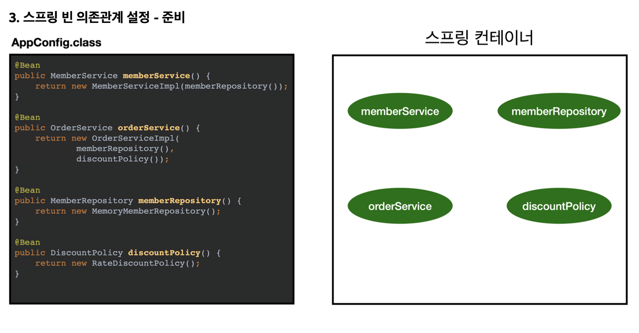 스프링 컨테이너는 이 설정 정보를 참고해서 의존관계를 주입해요. 설정 정보를 참고한다는 말은 AppConfig에서 뭘 필요해하는지를 보고 의존관계를 주입하는 걸 말합니다.