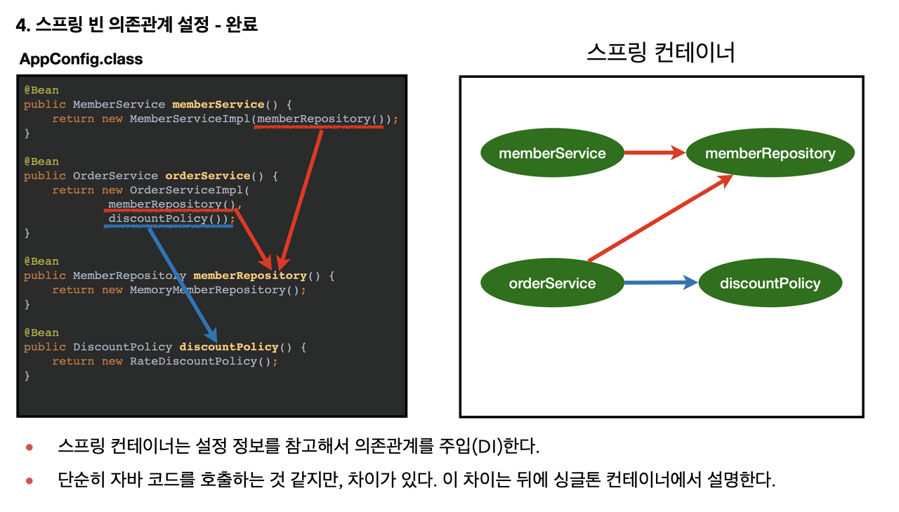 왜냐면, 스프링이 "@Bean을 보고 memberService를 호출해!"라고 했을 때, memberService를 호출하면서 MemberServiceImpl을 생성함과 동시에 memberRepository를 호출해버립니다. 그렇게 memberService를 부르는 순간 의존관계가 다 엮여져 버린단 말이에요.
