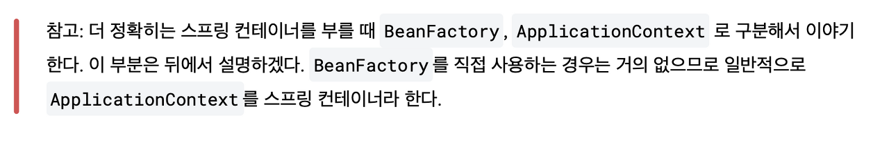 참고로 ApplicationContext를 스프링 컨테이너라고 표현을 하는데, 컨테이너는 안에 사용하는 객체들을 담고 있는 거예요. 더 정확히는 스프링 컨테이너를 부를 때 BeanFactory랑 ApplicationContext로 구분해서 이야기하는데, 이 부분은 뒤에서 설명할게요. BeanFactory를 직접 사용하는 경우는 거의 없기 때문에 일반적으로 ApplicationContext를 스프링 컨테이너라고 합니다.