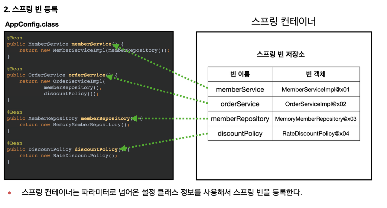스프링 컨테이너가 본인을 생성하면서 어떤 일을 하냐면, 스프링 빈 저장소에다가 스프링 빈들을 등록을 합니다. 어떻게 등록하냐면, 우리가 넘겼던 AppConfig 클래스 설정 정보를 하나씩 보면서, @Bean이 붙은 것들을 죄다 호출을 해요.