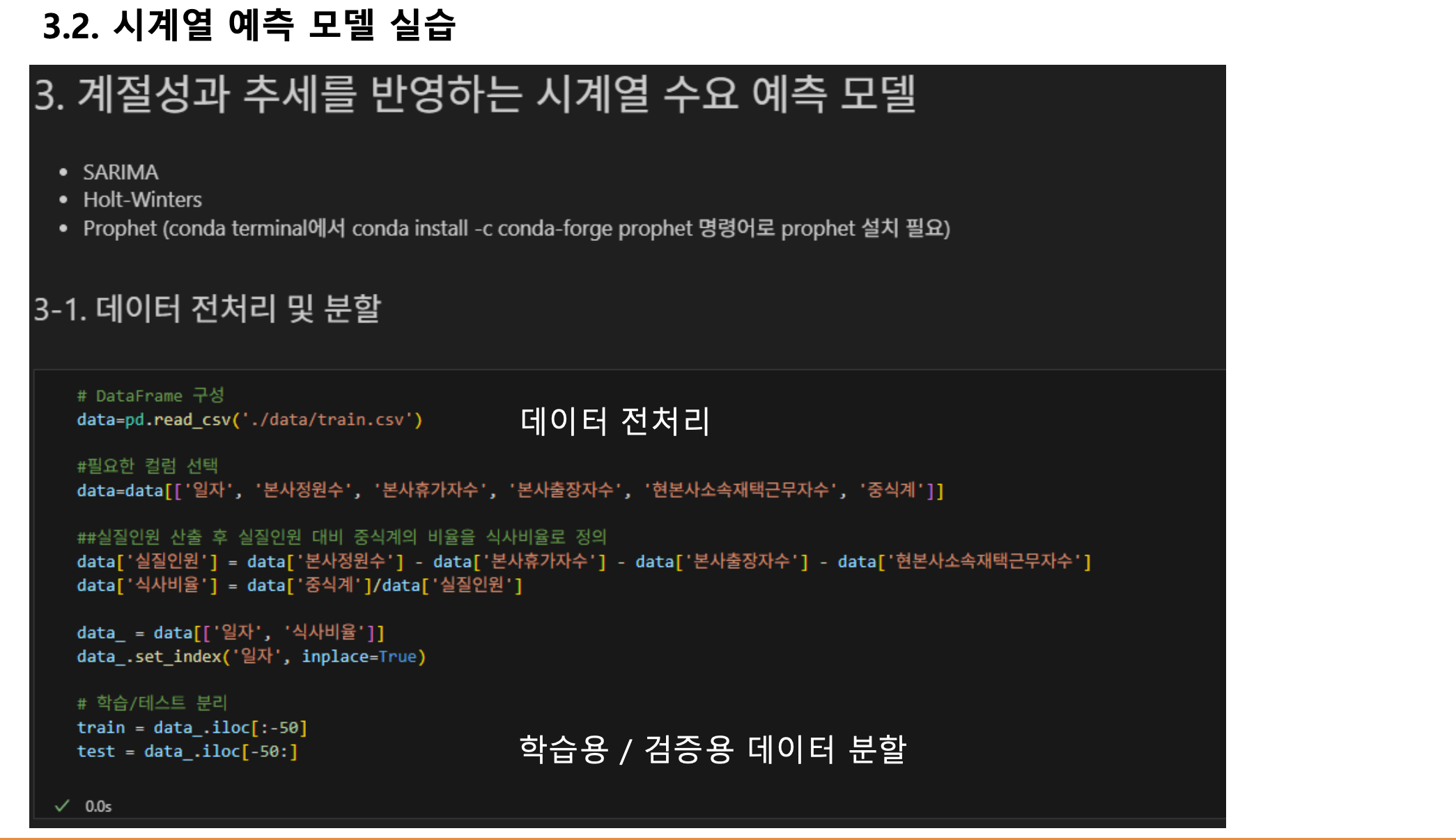 물론 홀트-윈터스 방법, Prophet 방법을 다 사용할 수 있는데 SARIMA를 사용하기 위해서 데이터 전처리 하는 방법에 대한 코드가 있음.