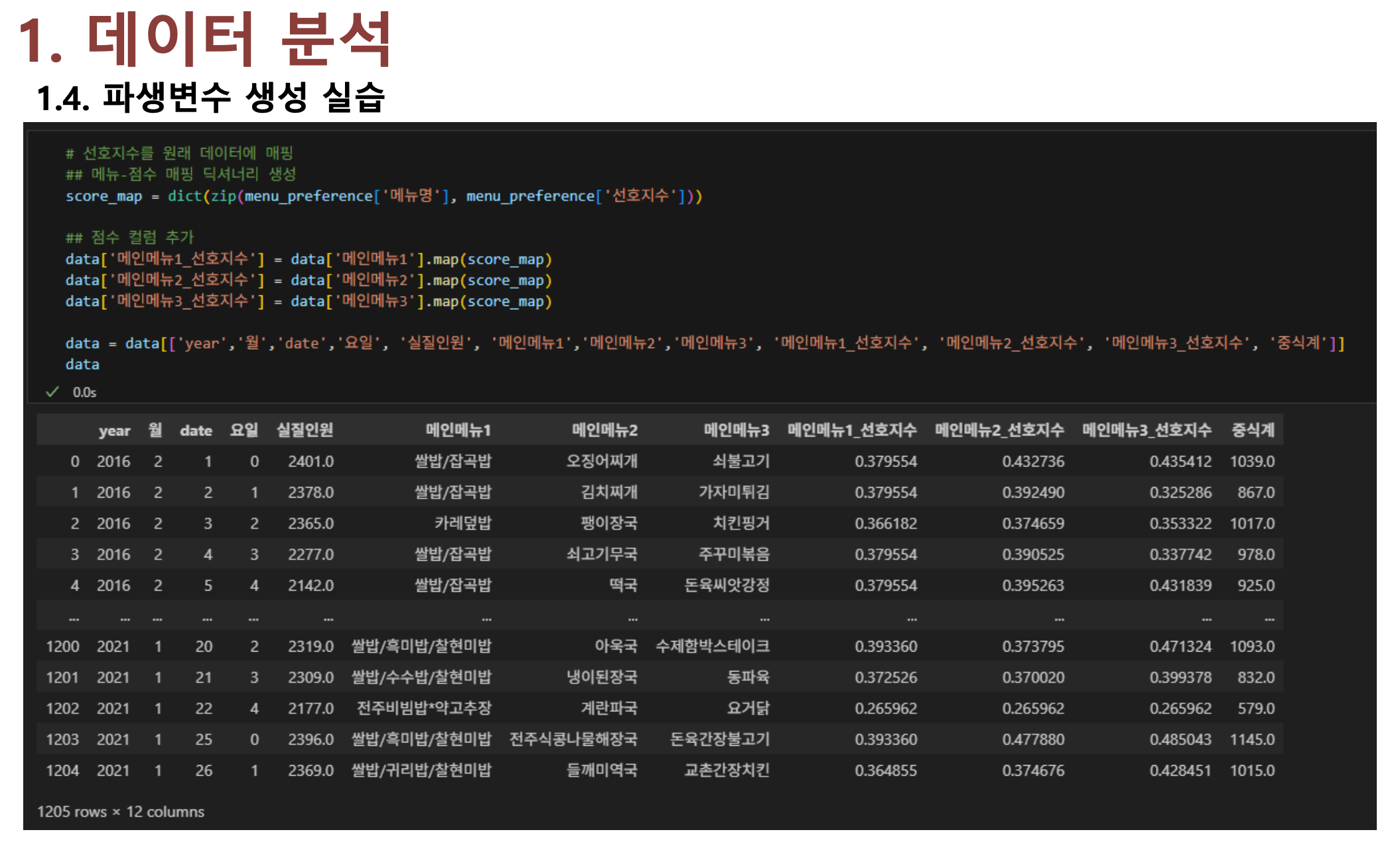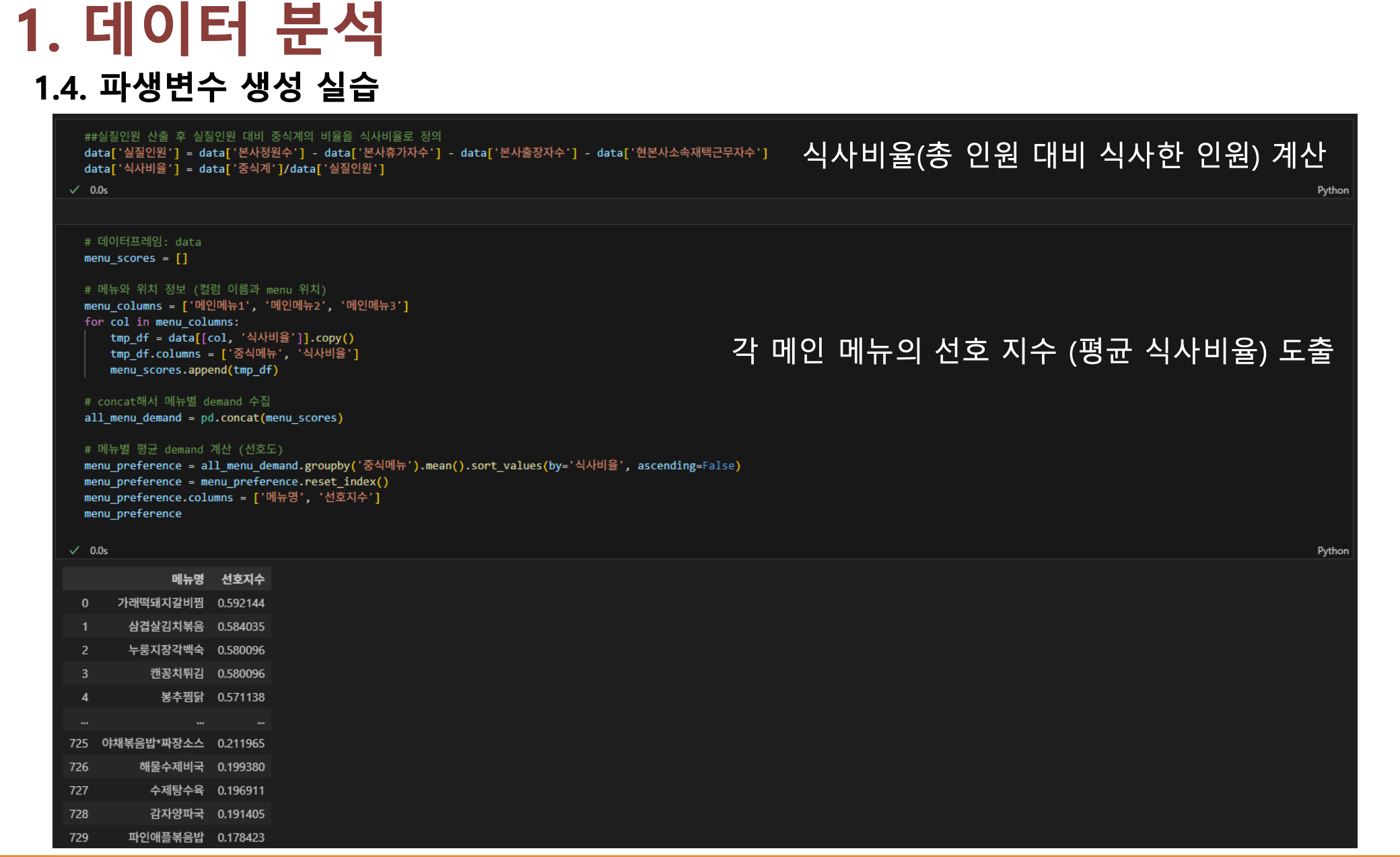또 다른 방법은 중식 메뉴의 메인 메뉴를 추출해서 각 메인 메뉴가 나왔을 때 식사 비율의 평균으로 선호지수(메뉴지수)을 산출할 수 있는데,