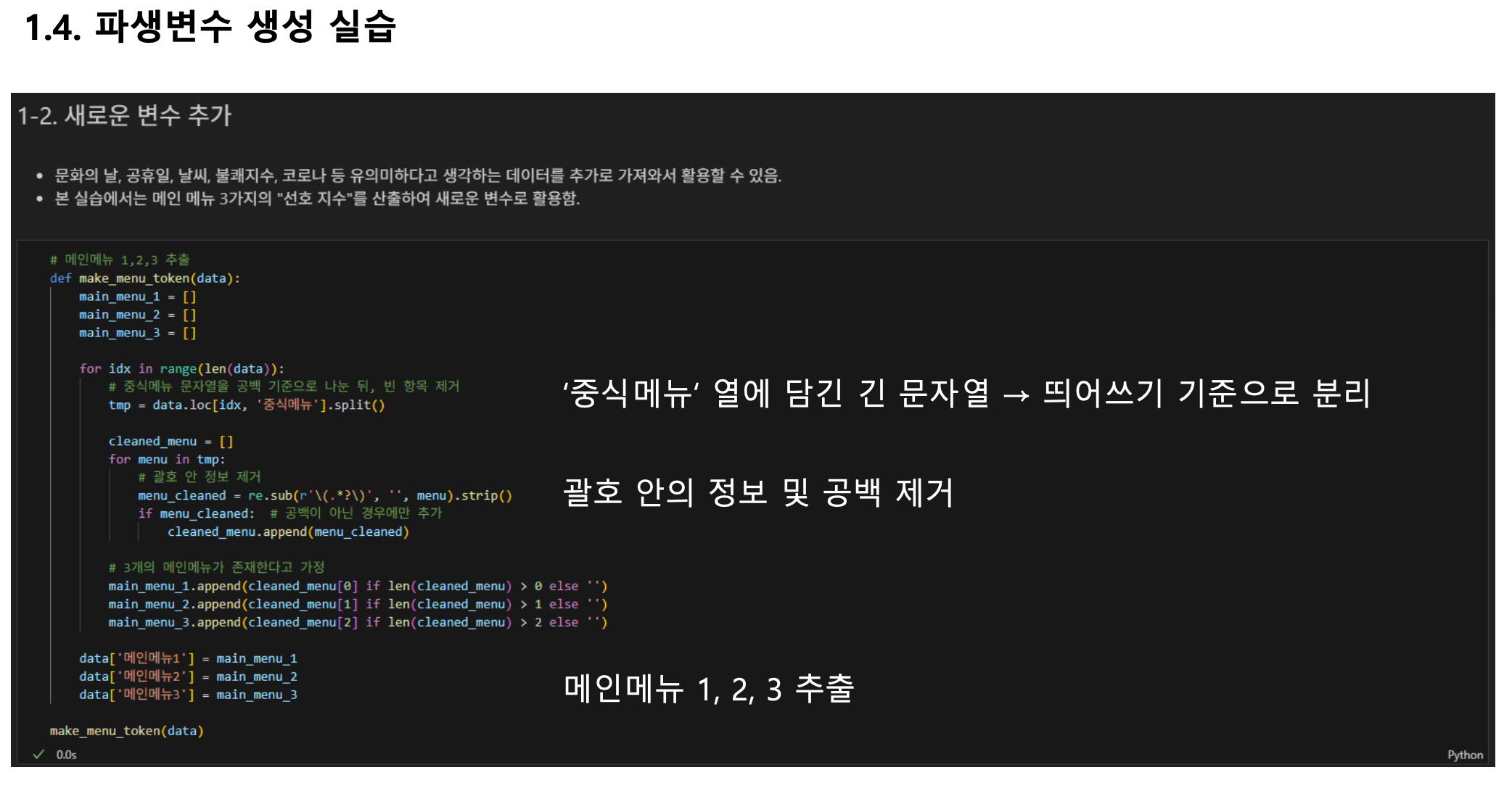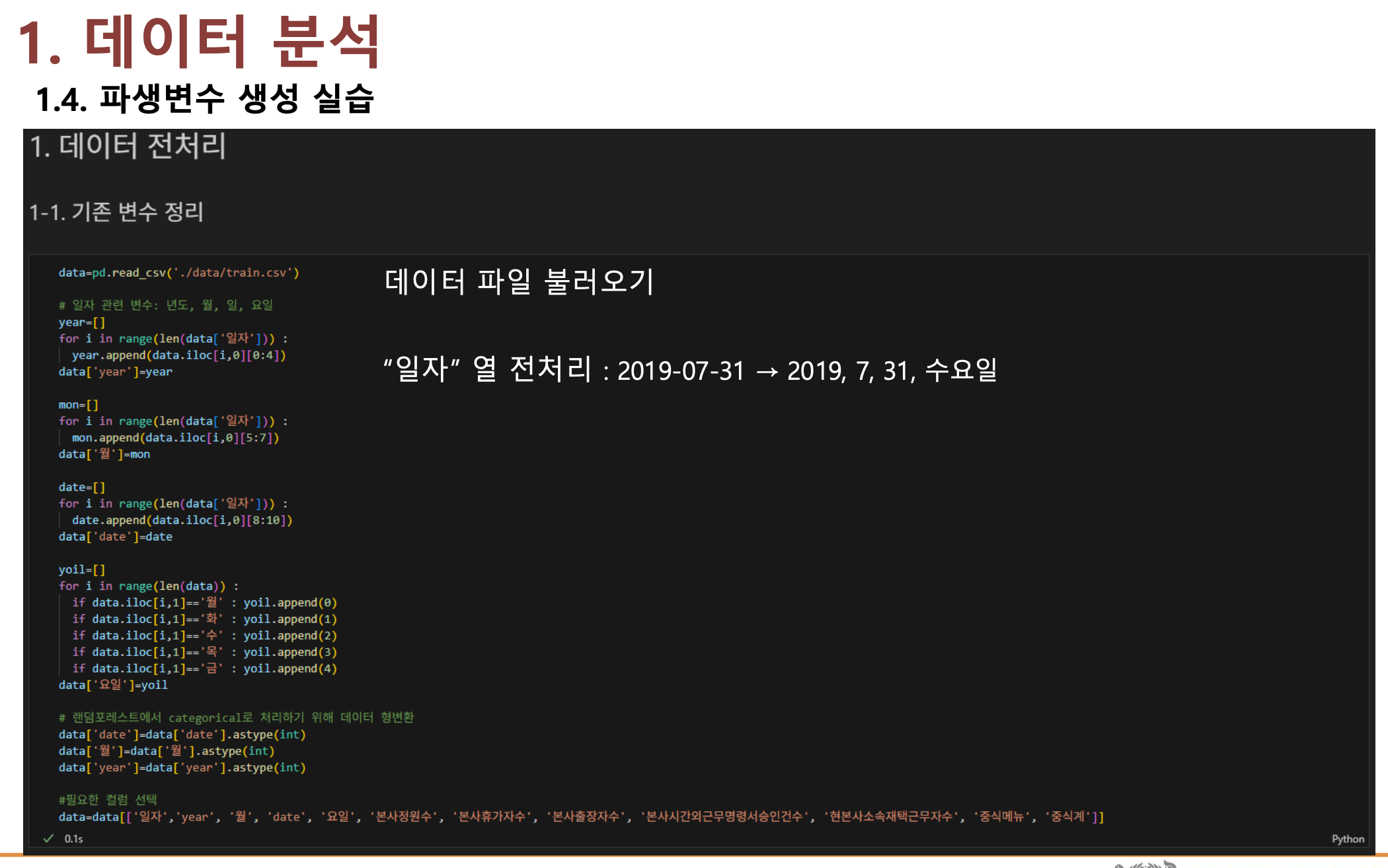 파생 변수 실습을 보면 데이터 전처리 작업이 필요함. 위처럼 날짜를 변환하는 것이 데이터의 전처리 작업임.