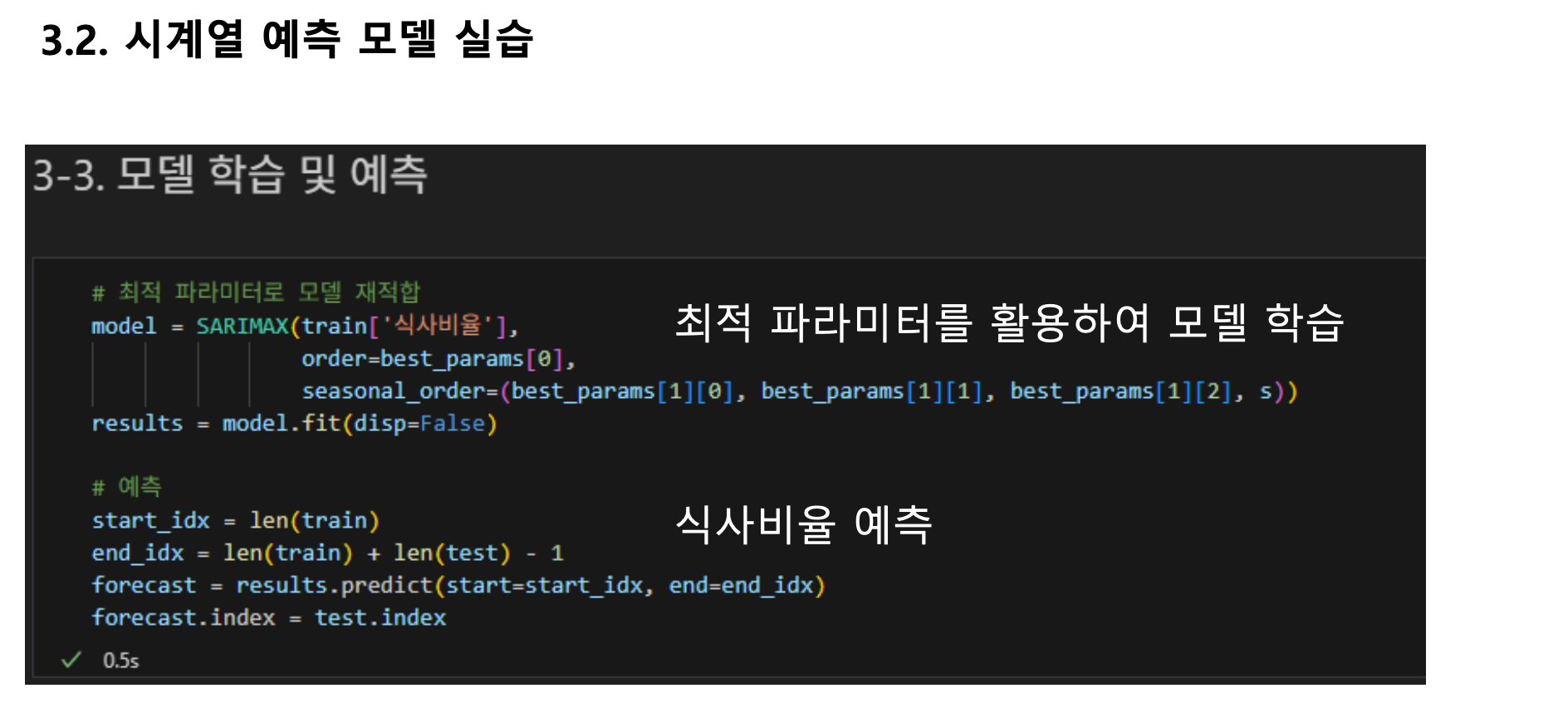 그리고 마지막에 찾았던 p, d, q를 사용해서 학습 시키고 마지막으로 식사 비율을 예측 하라는 코드임.